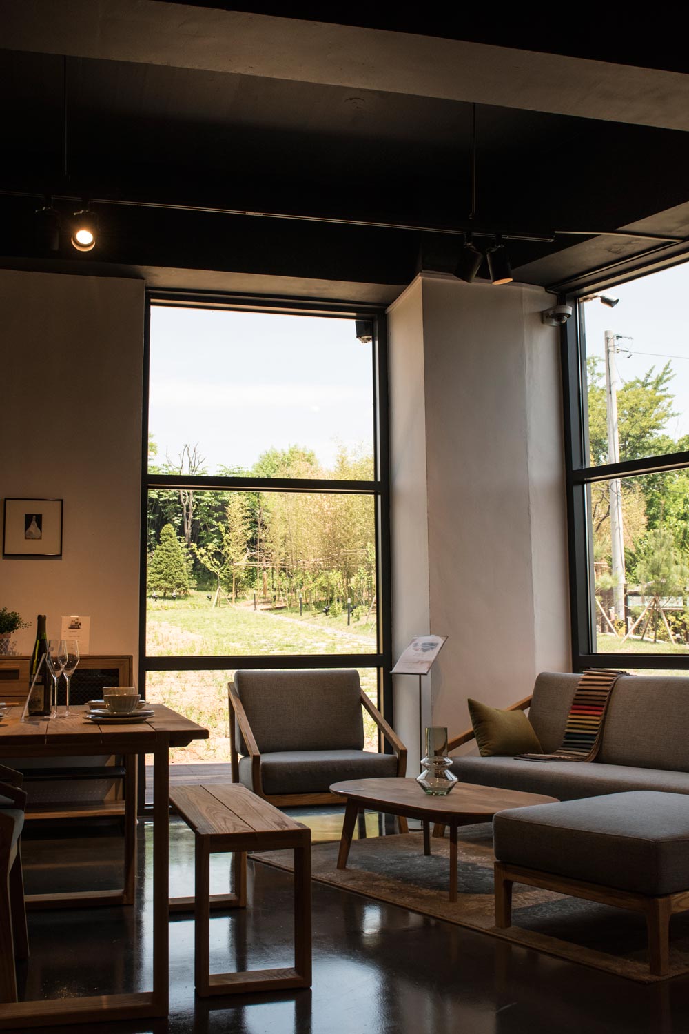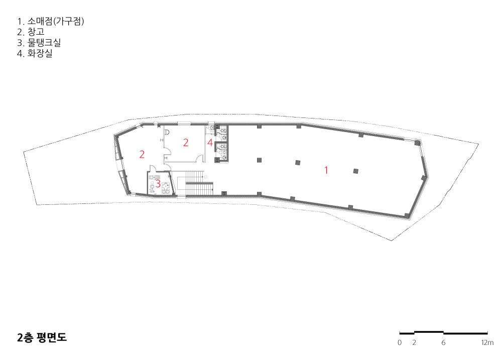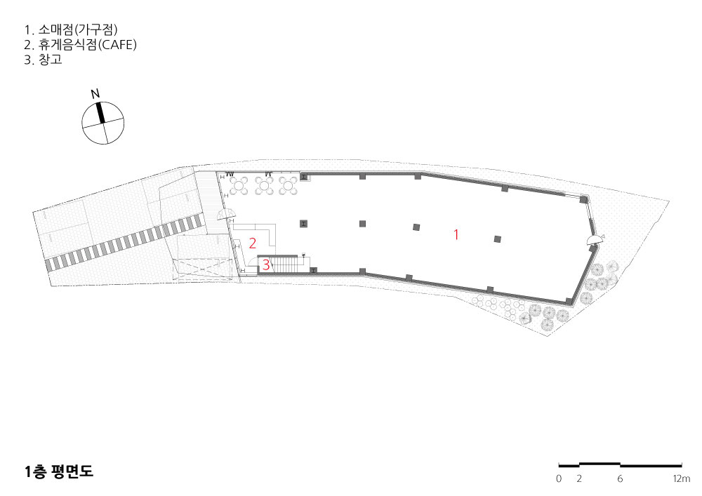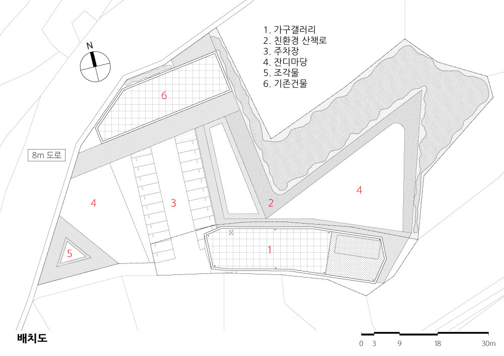 가로로 긴 형상의 대지는 진입도로를 통해 마주하게 된다. 가구가 전시되는 공간이기 때 문에 어떤 건축이 가구와 잘 어울릴지 고민이 많았다. 너(가구)의 배경이 되는 건축을 주 요 개념으로 생각했다. 긴 형상의 대지를 이용하여 산책로처럼 거닐면서 전시를 보고 중 간에 잠깐 휴식을 취할 수 있는 공간도 만들어 주었다.