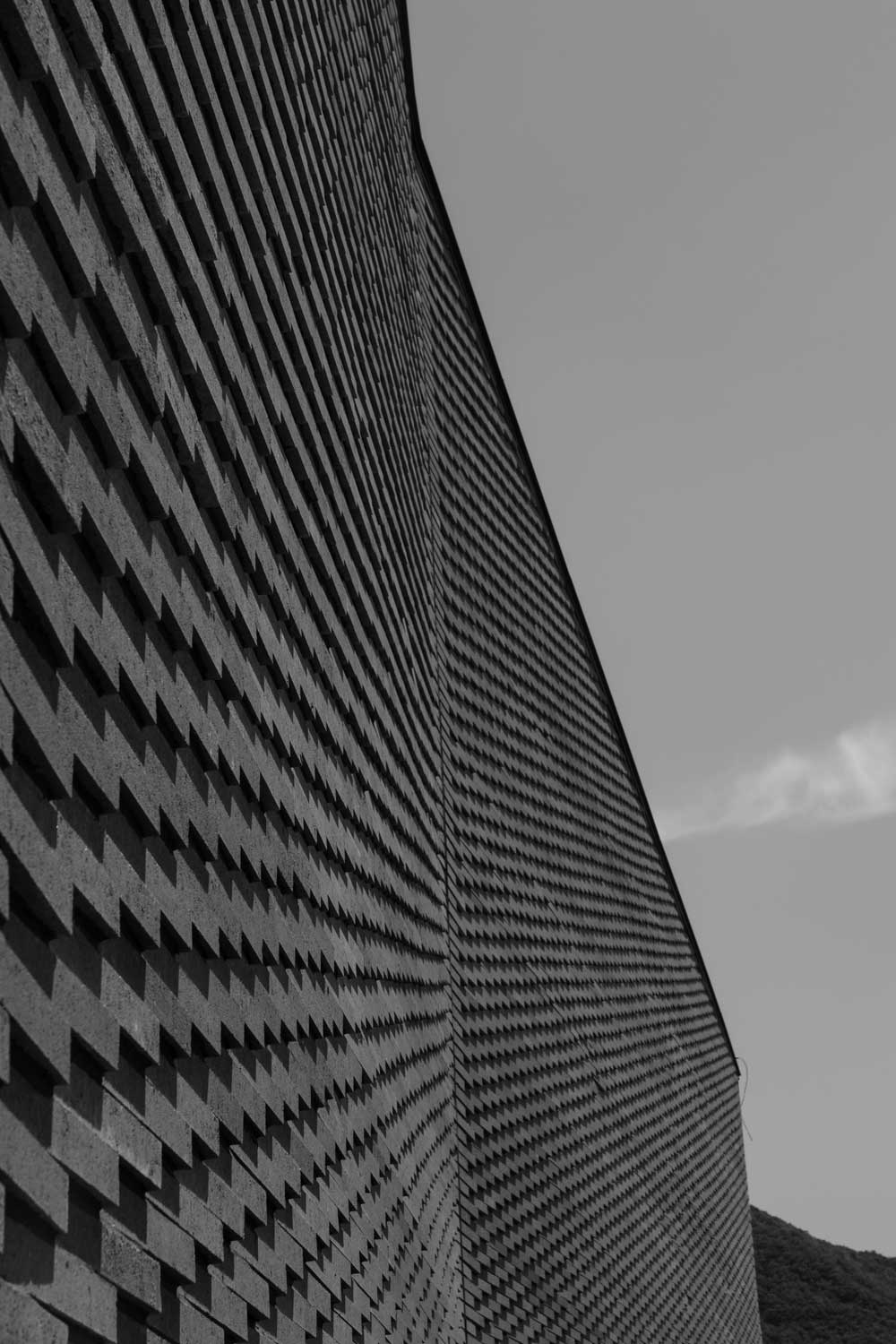 In the exterior finishes, I wanted to use achromatic cubic blocks (gray bricks) and black-stained red cedar. I considered these would provide a calm and sophisticated image in harmony with the surrounding environment. Because the long wall may be somewhat burdensome, I planned to give the elevation variety by to enable it to look different depending on the location and the movement of the sun. To achieve this I used Q block in a way of twisting brick masonry, because the facade is likened to a human face, it is designed in conjunction with the black-stained red cedar to welcome the incoming people.