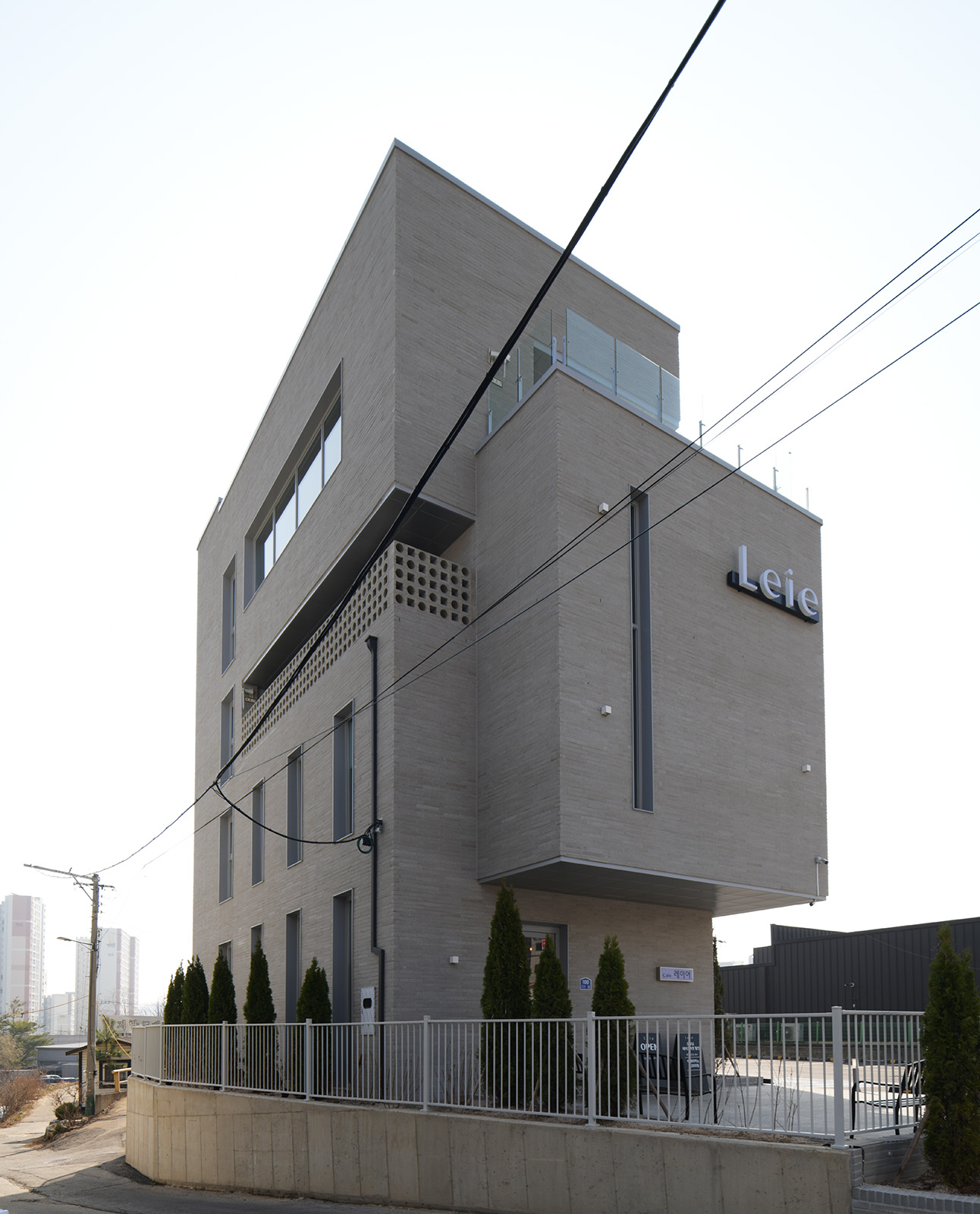 자칫 점잖고 길거리에 놓인 일반적인 건물과 밋밋한 마을에 나름대로의 멋을 부린 아이디어가 필요했기에 양감(Mass)의 변화가 필요했다. 하지만 한편으로는 예상치 못한 공사비의 상승으로 파격적인 디자인은 엄두를 낼 수 없었고 건축사의 입장에서 내부 마감을 과감히 없애고 노출콘크리트 제물마감을 제안했다. 하지만 다소 거친 콘크리트의 표면과 카페라는 공간에서의 먼지 비산에 대한 건축주의 걱정이 있어 내부 벽면마감을 코팅제로 도색을 하게 되었다. 그러나 도장 공사 후 예상 밖 콘크리트의 수분흡수에 따른 거칠고 보기 흉한(칙한) 색의 등장으로 모두 난처한 상황에 놓이게 되었다. 겪어보지 못한 시행착오를 거치면서 결국 공사비와 공사기간에 문제가 생겼다. 결국 콘크리트 본연의 색에 가까운 밝은 회색의 도장 공사를 한 후 천만다행으로 비교적 기존의 콘셉트에 가까운 질감의 결과를 만들어낼 수가 있었다. 외벽의 롱브릭 벽돌 그리고 맑은 유리와 조화된 알루미늄 프레임을 통해 다소 지체되긴 했지만 우여곡절 끝에 어느 정도 만족할만한 공간이 탄생하게 되었다. 한 가지 덧붙인다면 ‘벨기에’에서 유학을 하고 온 건축주 큰 아들의 ‘쇼콜라티에(chocolatier)’라는 흔하지 않은 초콜릿 자격을 좀 더 발전시키기 위하여 카페의 이름을 ‘레이어(Leie, 벨기에 강이름)’라고 부르기로 하고 브랜드 디자인공모를 통해 건물 간판과 머그컵 등에 적용을 했다. 아침 식사를 대신할 샌드위치로 오늘도 아침 8시가 되면 이곳은 도시인들의 마음을 마중하고 있다.