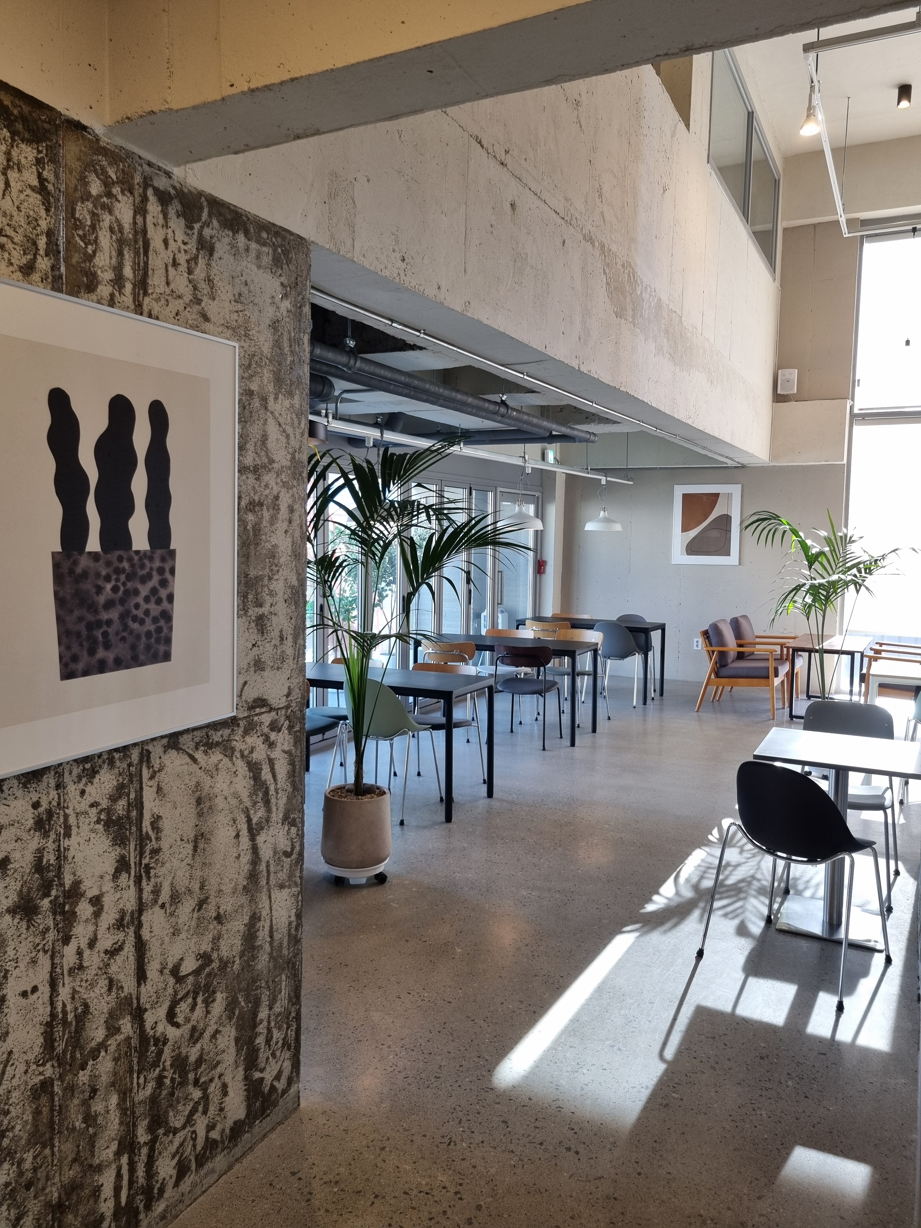 However, the client was concerned about dust and the rough texture of exposed concrete, especially for a café. So, the walls were painted with a sealant. Unfortunately, the resulting color—caused by moisture absorption as dull and uneven. This unforeseen issue affected both our schedule and budget. Eventually, we repainted the walls in a bright gray close to natural concrete, which fortunately brought us closer to the original concept.