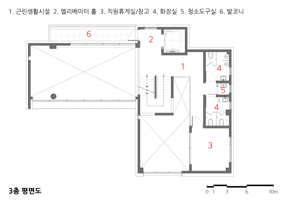 건폐율과 용적률의 한계. 이를 극복하기 위한 Mass의 조절은 결국 공간을 비우는 일이다. 비어 있다는 것은 다시 말하면 채우는 일이기도 하다. 달라지는 것은 창의 크기, 그리고 바라볼 수 있는 양(量)이 커진다는 것이기에 아침이면 창을 열고 갓 만들어진 샌드위치 향을 마음껏 들이킬 수 있고 365일 언제나 빈 의자처럼 사람을 기다리고 있는 배려와 여유 함께 따라온다. ‘화려하기보다는 매력이 있는’ 건축물, ‘개인적이기보다는 개성적인’ 건축물, ‘최상보다는 최선이 먼저인’ 마을의 작은 구심점이 되기를 기대하는 마음으로 공간이 메워지기를 바란다. 시간이 지나면 마을과 길이 동화되고 누구나 마실 나오듯 가까운 친구 같은 쉼 공간이었으면 한다. 그것이 건축이 존재하는 이유이기도 하다. 주변을 압도하는 ‘힘(力’)과 ‘색(色)’보다는 1년이 되어도 10년이 된 듯한 공간, 10년이 되어도 1년이 된 듯한 공간이기를 애써 바래 본다. 1층에서 주문을 하고 세 개 층으로 구성된 카페 공간은 ‘마음 산책(mind stroll)’하기에 충분하도록 공간 분리를 도모하고 구조적 ‘자연색’을 이용하여 큐(Q) 블럭으로 ‘소통’의 의미를 부여하면서 개방감을 강조하였다. 눈물도 해를 만나면 빛난다고 했다. 비록 풍족한 예산은 아니었지만 건축사와 건축주가 공감하고, 공간과 마을이 공감하는 어느 누구에게 어느 날 아주 특별한 선물같은 날들이기를 바란다.