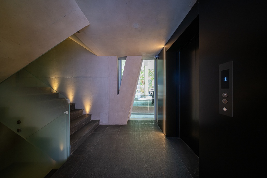 하나의 다이어고날 패턴은 4개 층의 입면을 분할하며, 각 층의 코너 뷰는 열림과 닫힘을 반복해 다양한 시각적 경험을 제공한다. 임대 건물의 필요 조건인 선큰, 마당, 외부 계단, 층별 화장실, 실용 층고 등의 요소는 협소 부지라는 한계에서 다소 타협이 불가피했다. 아마도 다양한 시퀀스를 시도해보고자 했던 건축사의 바람이 아닐까.