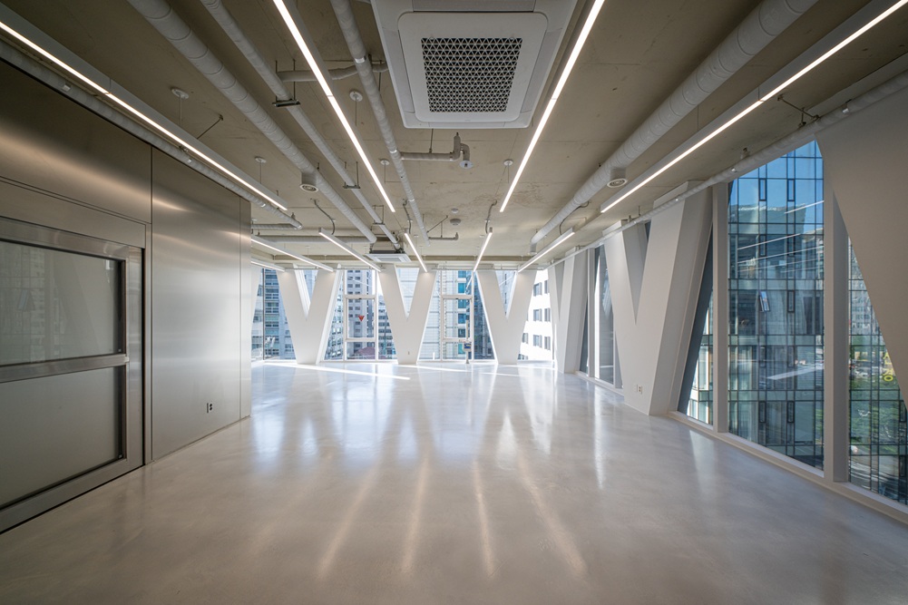 강한 형태적 역동성은 다소 단순한 매스 형태로 제안되었을 수 있으나, 이는 화이트 노출 콘크리트가 지닌 순수성과 ‘다이아몬드 같은 영원성’을 상징하는 블랑드부라는 회사의 브랜드 철학과도 맞닿아 있다. 1층은 최대한 비워 공공성을 부여하고, 코너를 열어 보이도록 해 플로팅 필로티의 개방감을 갖도록 했다.