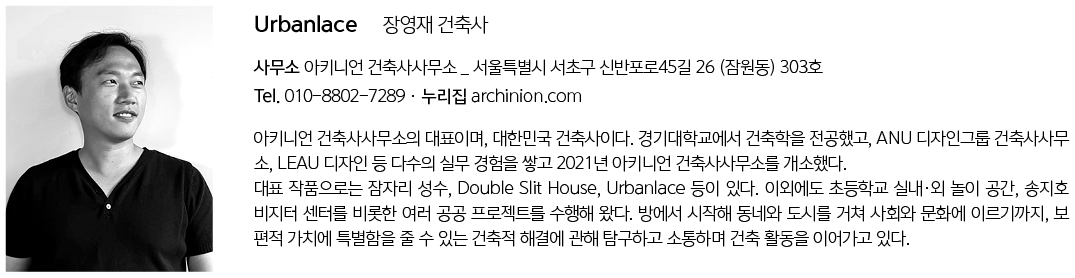 | Urbanlace 설계자 | 장영재 _ 아키니언 건축사사무소 건축주 | 제이윤 감리자 | 장영재 _ 아키니언 건축사사무소 시공사 | 무원건설 설계팀 | 오인탁 대지위치 | 서울특별시 노원구 공릉동 주요용도 | 근린생활시설 대지면적 | 147.90㎡ 건축면적 | 78.93㎡ 연면적 | 593.38㎡ 건폐율 | 51.44% 용적률 | 343.28% 규모 | B1F - 9F 구조 | 철근콘크리트구조 외부마감재 | 벽돌 타일, 금속메쉬 내부마감재 | 시멘트 미장, 석고보드 위 도장 설계기간 | 2022. 07 – 2023. 06 공사기간 | 2023. 08 – 2025. 02 사진 | 길민규, 오인탁 구조분야 | 푸른구조기술사사무소 기계설비·전기·소방분야 | 하랑엔지니어링 |