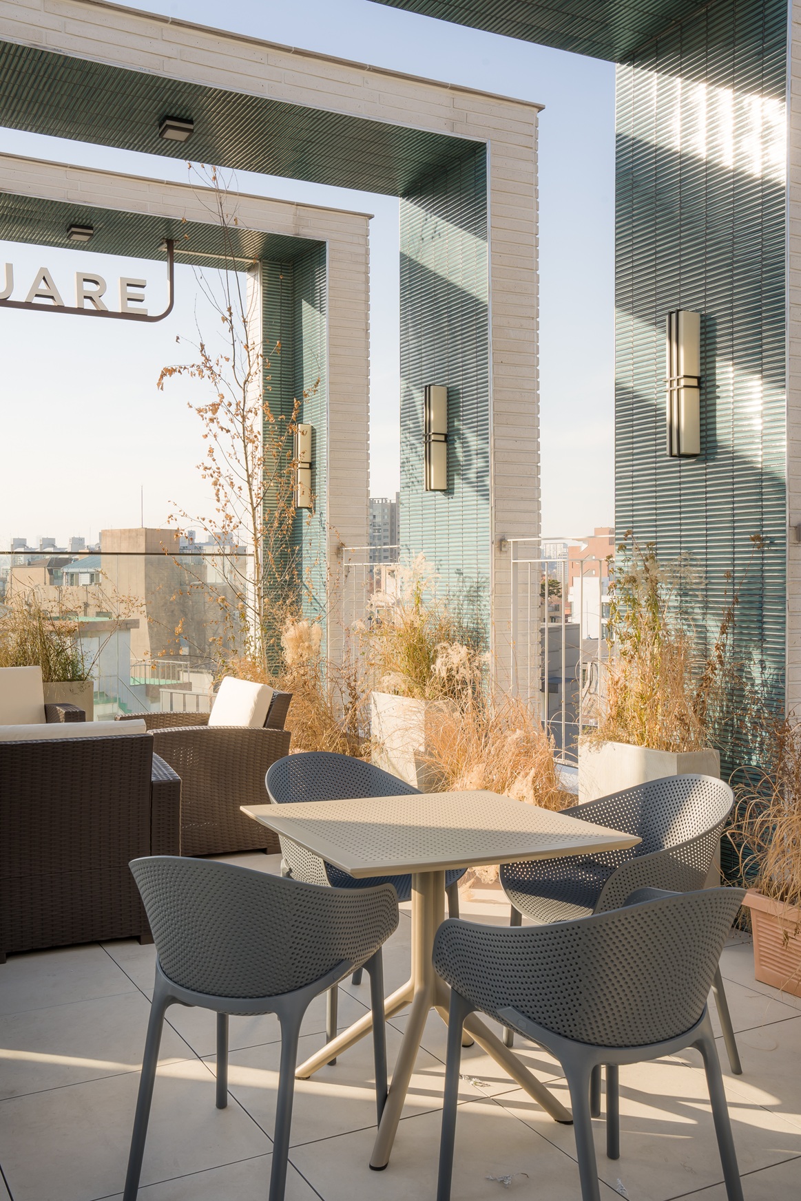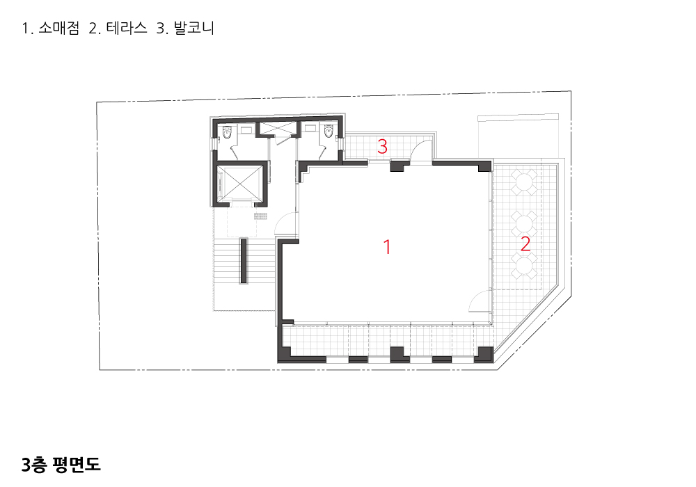 두 방향의 가로와 접한 대지조건을 활용해, 코너부에 상가를 배치함으로써 거리를 지나가는 사람들의 이목이 집중될 수 있도록 했다. 상하층을 직관적으로 연결할 수 있도록 주계단은 외부계단으로 계획하고, 지하로 내려갈 수 있는 별도의 계단을 마련했다. 상부 매스는 단순한 박스형이 아닌, 전면과 측면에서 리듬감 있게 쌓아올리는 구성을 통해 거리 분위기와 어울리는 입체감 있는 형태를 만들어냈다. 또한 모든 층에 크고 작은 테라스를 배치하여 거리와 시각적으로 연결될 수 있도록 했고, 외부를 향해 열린 공간 속에서 도시와 교감할 수 있도록 했다.