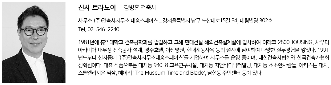 | 신사 트라노이 설계자 | 강병훈 _ (주)건축사사무소 대흥스페이스 건축주 | 정윤택, 정승연 감리자 | 강병훈 _ (주)건축사사무소 대흥스페이스 시공사 | (주)스톤빌리지종합건설 설계팀 | 고용준, 송석현, 이규원 설계의도 구현 | (주)건축사사무소 대흥스페이스 대지위치 | 서울특별시 강남구 신사동 주요용도 | 근린생활시설(일반음식점, 사무소) 대지면적 | 289.30㎡ 건축면적 | 154.26㎡ 연면적 | 728.81㎡ 건폐율 | 53.32% 용적률 | 199.93% 규모 | B1F - 5F 구조 | 철근콘크리트구조 외부마감재 | 롱브릭타일 내부마감재 | 유로폼노출콘크리트, 발수재 설계기간 | 2022. 05 – 2022. 08 공사기간 | 2022. 09 - 2023. 06 사진 | 서성민 구조분야 | (주)본구조 기계설비·전기·소방분야 | (주)제이유앤기술단 |