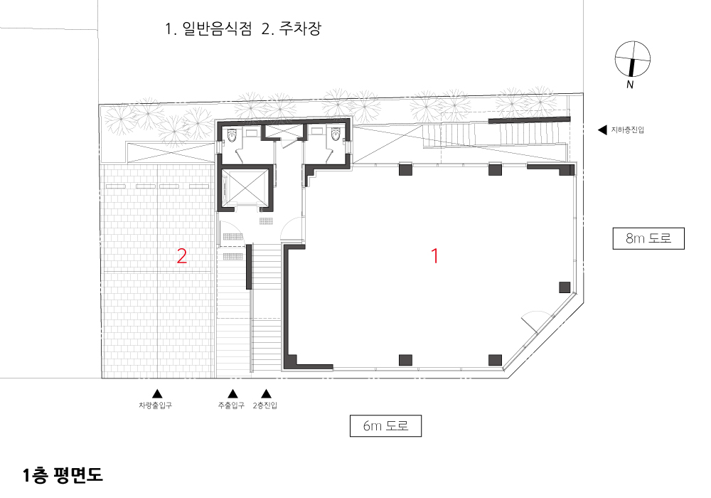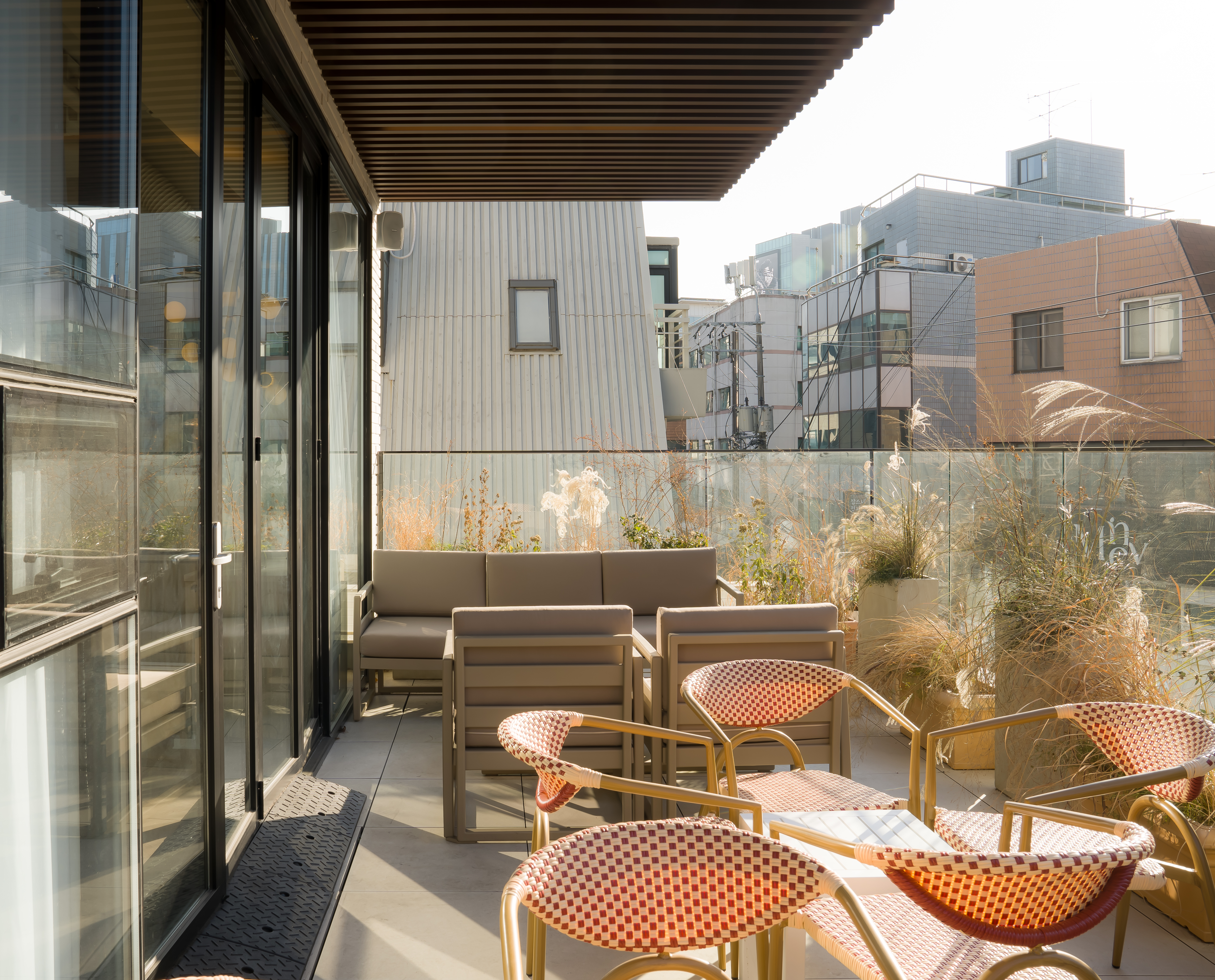 북측 도로면은 세로수길과 가로수길을 이어주는 중요한 보행 흐름이 이어지는 공간인 동시에 정북 일조 제한이라는 법적 제약이 작용하는 면이기도 하다. 이러한 법적 제약을 디자인 요소로 활용하여, 구조를 외부로 드러내는 입면 계획을 통해 수직성을 강조하며 좁은 골목길에서도 시선을 끄는 건축물을 만들 수 있었다. 이 건물의 이름인 ‘트라노이(TRANOI)’는 이탈리아어로 ‘우리끼리’라는 뜻이다. 단지 상업적 소비의 장소가 아니라, 함께 머무르고 공유하는 도시 속 소규모 커뮤니티의 거점으로 기능하길 바랐다. 특히 반려견과 함께 이용할 수 있는 공간으로 활용되고 있어, 새로운 도시 라이프스타일에 응답하는 열린 장소로서의 기능을 수행하고 있다.