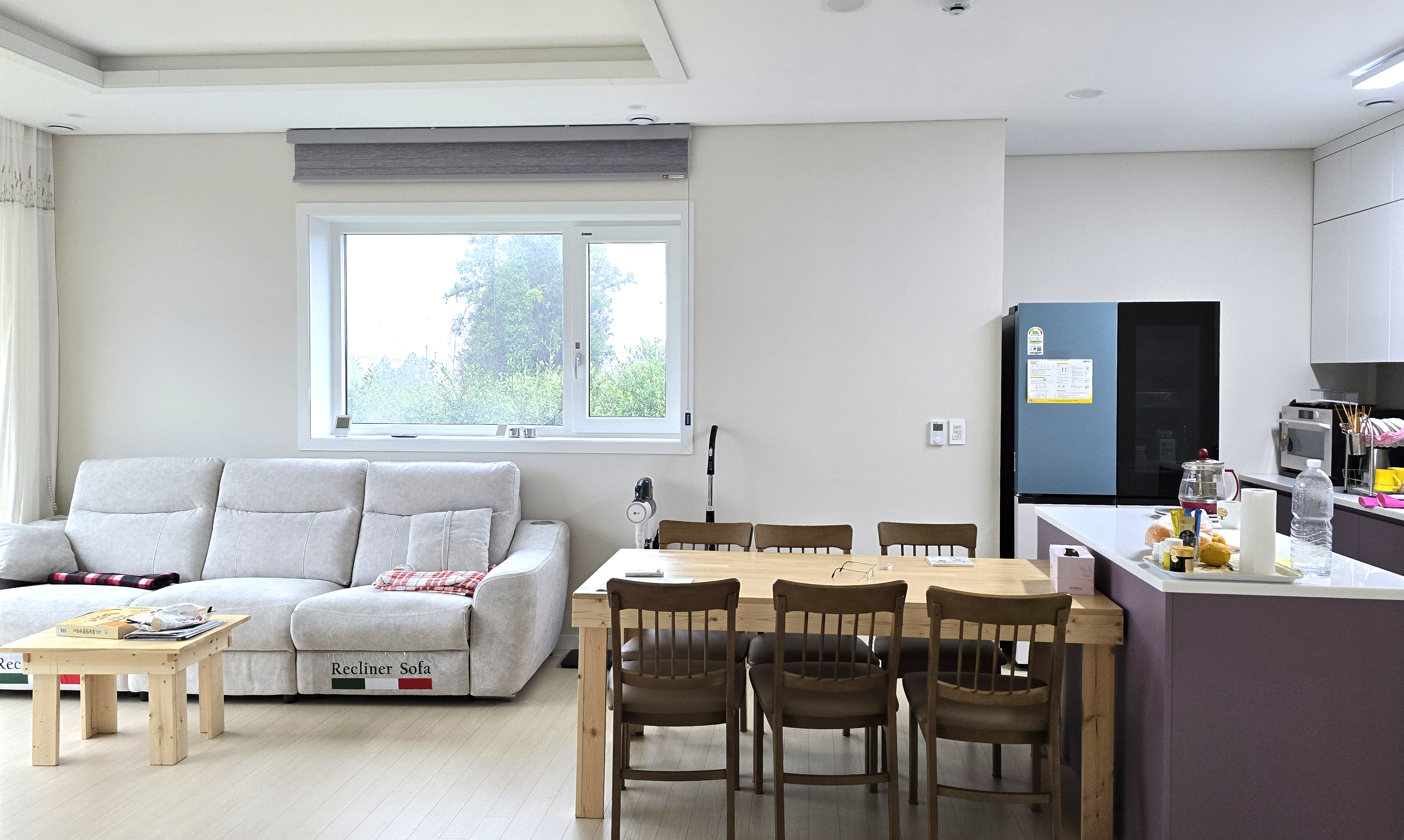 The building consists of a 24-pyeong first floor and a 20 pyeong second floor, with the two levels functionally separated to support independent living. The interior corridor is intentionally widened to provide a sense of openness, and the second floor features a spacious terrace and a compact kitchenette, enabling residents to enjoy light cooking and tea time while taking in the surrounding scenery. Each room on the second floor offers views of both Sanbangsan and Hallasan, allowing the beauty of Jeju’s landscape to be fully appreciated in daily life.
