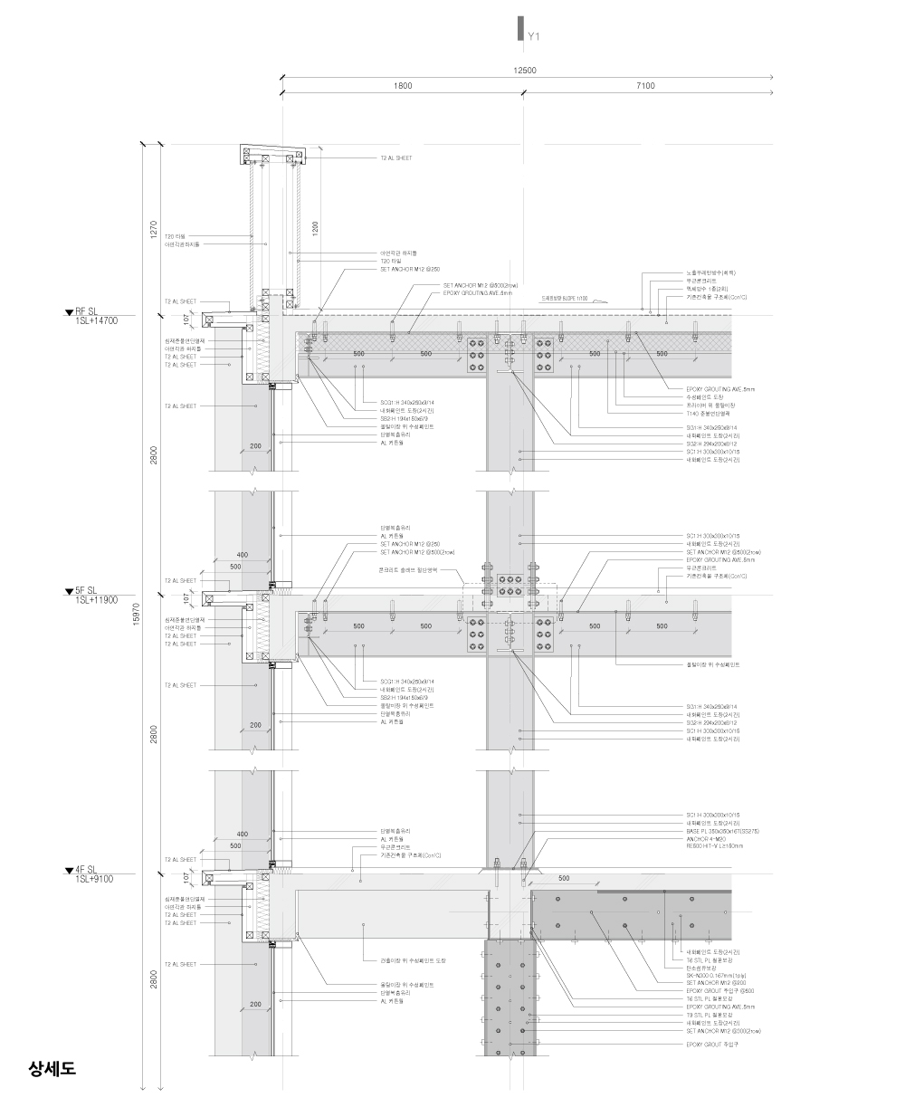 기존의 철근 콘크리트 구조를 보강하고, 연와조 구조를 철골조로 치환했다. 그리하여 기존 주거용도의 내력벽으로 구획된 방들을 제거하여 근린생활 시설의 공간 구성에 합당한 대공간으로 변용이 가능했다. 기능적으로 전 층이 근린생활시설이기 때문에 내·외부 간의 소통을 위한 표면적을 고양시키기 위해서 전면 전창들을 도입했다. 입면은 입방체의 건물의 속성에 기반해 그리드 형태를 바탕으로 균질성을 확보하려 했다. 균질성 속에서 변화의 리듬을 만들기 위하여 입면 요소요소들의 깊이를 4단계로 계획했다.