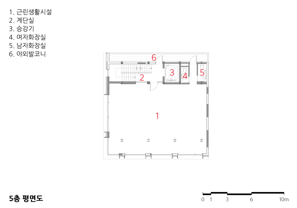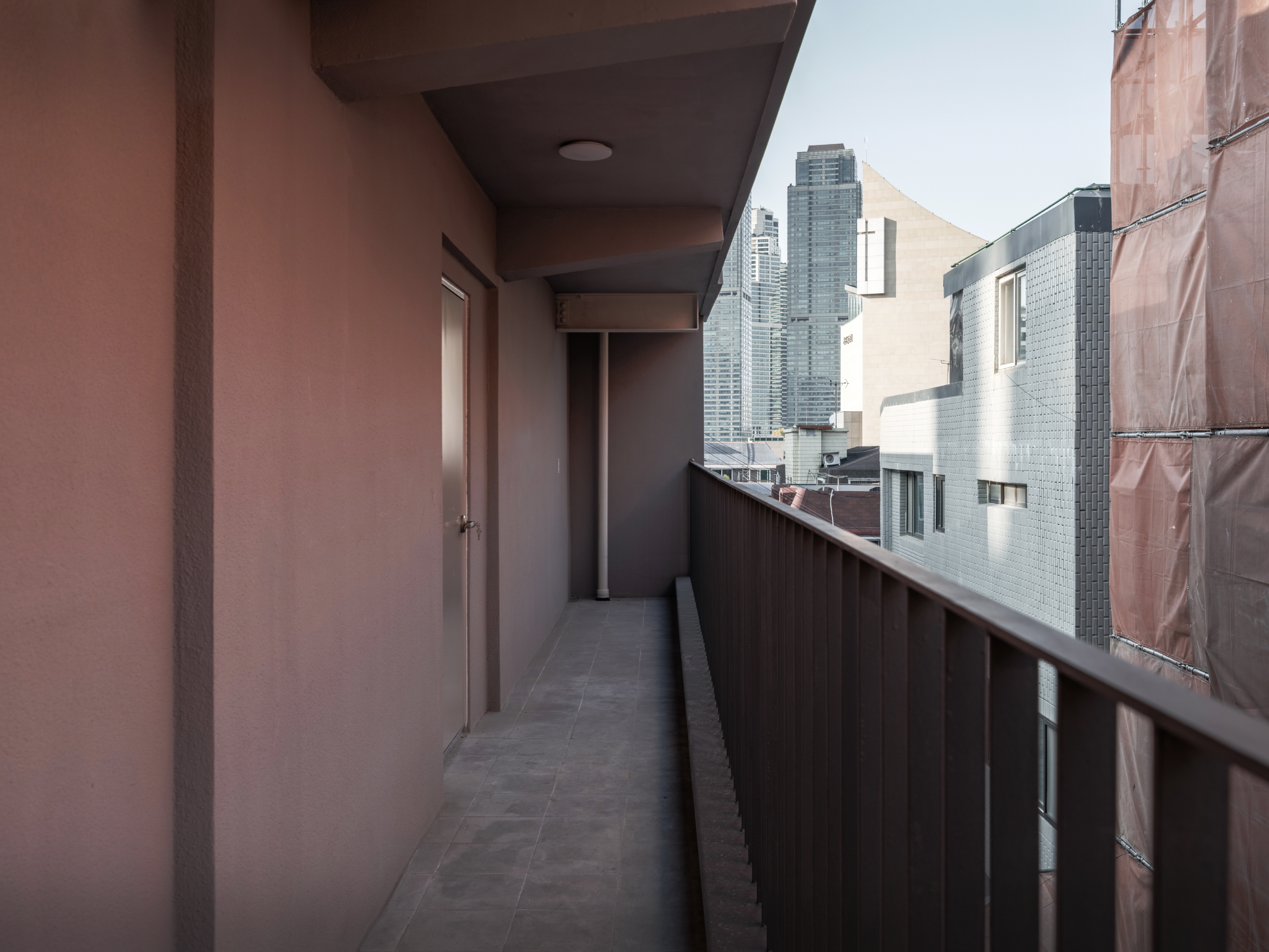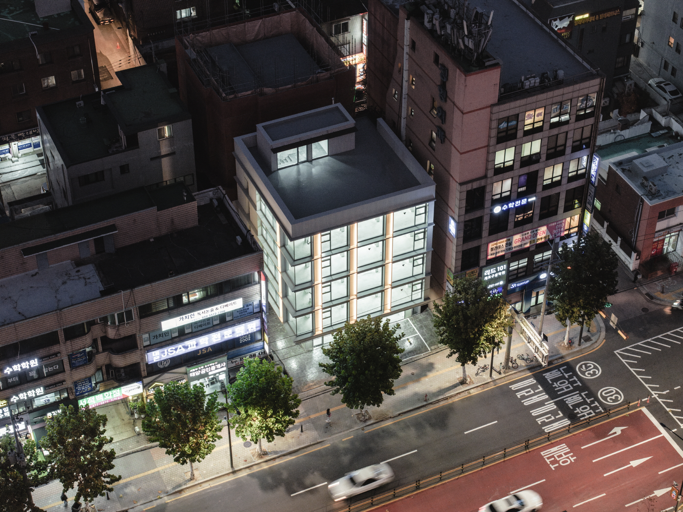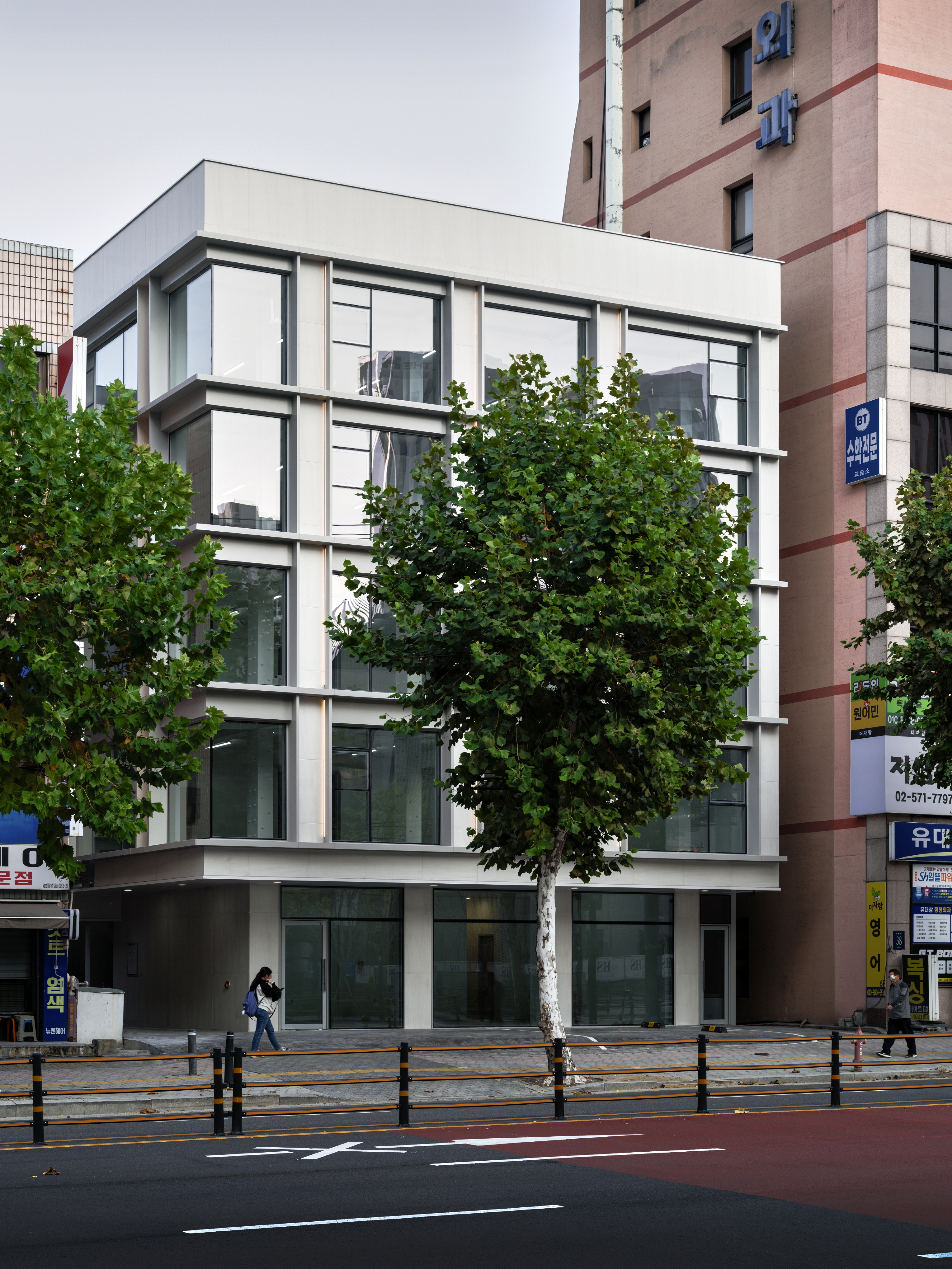 The site sits along a 20-meter-wide street in Gaepo-dong, Gangnam-gu, within a Type 3 general residential zone. The project was a major renovation of a six-story (1 basement, 5 above-ground) multi-family building from the early 1990s, constructed in a hybrid of reinforced concrete and brick masonry. It involved a full transformation: not only remodeling the structure but also changing its function from residential use to neighborhood commercial facility, reestablishing a spatial system that responds to present-day needs.