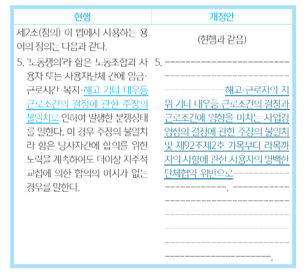 따라서, 개정안은 노동쟁의를 ‘임금·근로시간·복지·해고·근로자의 지위 기타 대우 등 근로조건의 결정과 근로조건에 영향을 미치는 사업상의 결정에 관한 주장의 불일치 및 제92조 제2호 가목부터 라목까지의 사항에 관한 사용자의 명백한 단체협약 위반으로 인하여 발생한 분쟁상태’로 규정하여 정당한 쟁의행위의 범위가 확대될 수 있도록 한다(안 제2조 제5호).