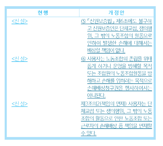 또한, 사용자는 노동조합의 존립을 위태롭게 하거나 운영을 방해할 목적 또는 조합원의 노동조합활동을 방해하고 손해를 입히려는 목적으로 손해배상청구권을 행사하여서는 아니된다고 규정하였으며(안 제3조 제6항 신설), 사용자가 단체교섭 또는 쟁의행위, 그 밖의 노동조합의 활동으로 인한 노동조합 또는 근로자의 손해배상 등 책임을 면제할 수 있도록 하였다(안 제3조의2 신설).