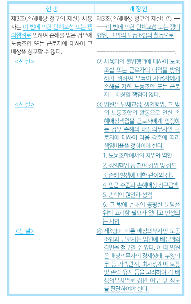 따라서, 개정안은 사용자는 노동조합법에 의한 단체교섭 또는 쟁의행위, 그 밖의 노동조합의 활동으로 인하여 손해를 입은 경우에 노동조합 또는 근로자에 대하여 그 배상을 청구할 수 없도록 하고(안 제3조 제1항), 사용자의 불법행위에 대하여 노동조합 또는 근로자의 이익을 방위하기 위하여 부득이 사용자에게 손해를 가한 노동조합 또는 근로자는 배상할 책임이 없다고 규정하였다(안 제3조 제2항 신설).