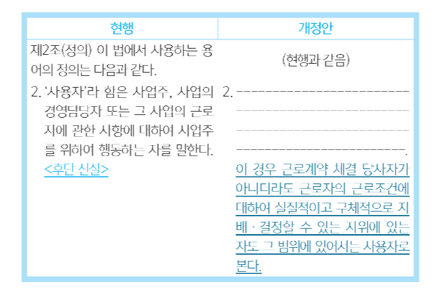 따라서, 개정안은 근로계약 체결 당사자가 아니더라도 근로자의 근로조건에 대하여 실질적이고 구체적으로 지배·결정할 수 있는 지위에 있는 자도 사용자로 본다고 규정하여, 현행 노동조합법상 사용자의 범위를 확대한다(안 제2조 제2호 후단 신설).
