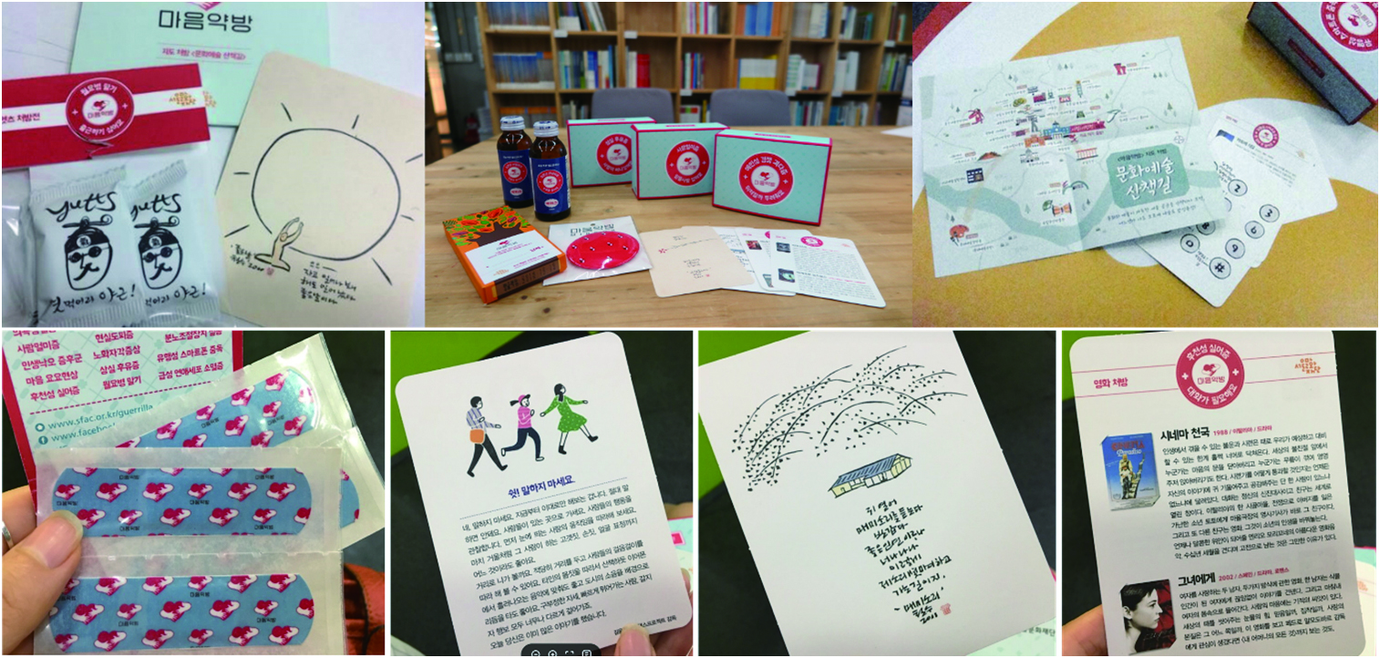 예를 들어 ‘월요병 말기’ 증상의 처방 상자 안에는 이철수 화백의 그림 ‘좋은 날’과 당 떨어진 ‘야그너(야근+er; 야근하는 사람)’의 에너지 충전을 위한 엿, 그리고 서울의 문화예술 명소를 안내한 지도가 들어 있다. ‘미래 막막증’의 처방약은 시장 산책길 지도, 영화 처방, 이철수 화백의 ‘잡초’ 그림 그리고 반창고로 구성되어 있다.