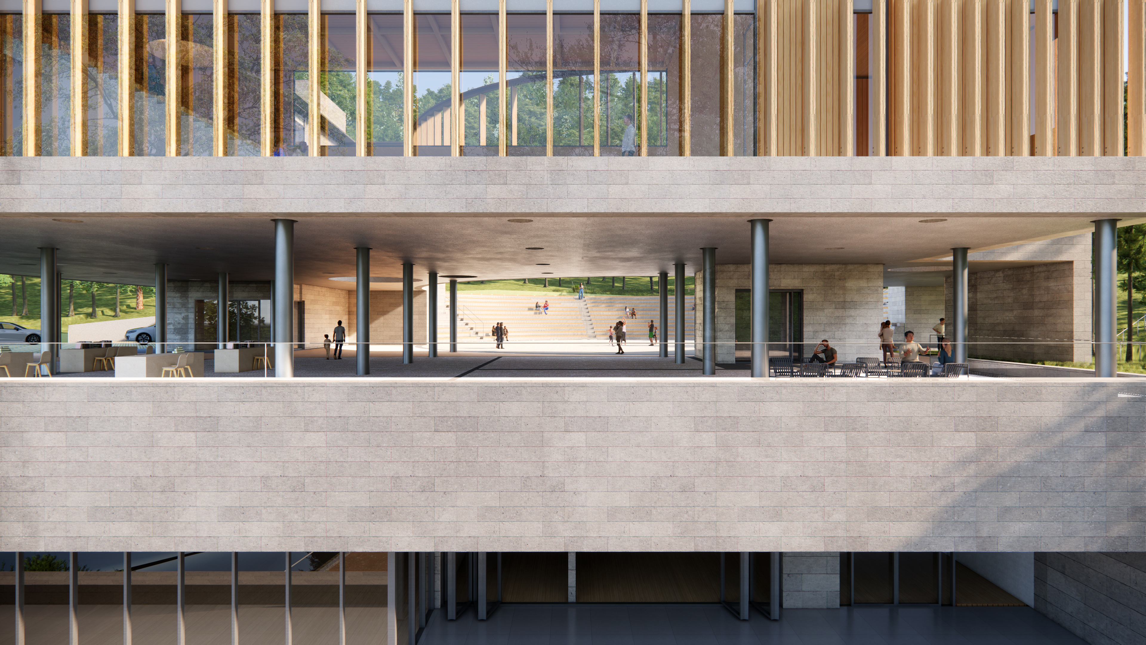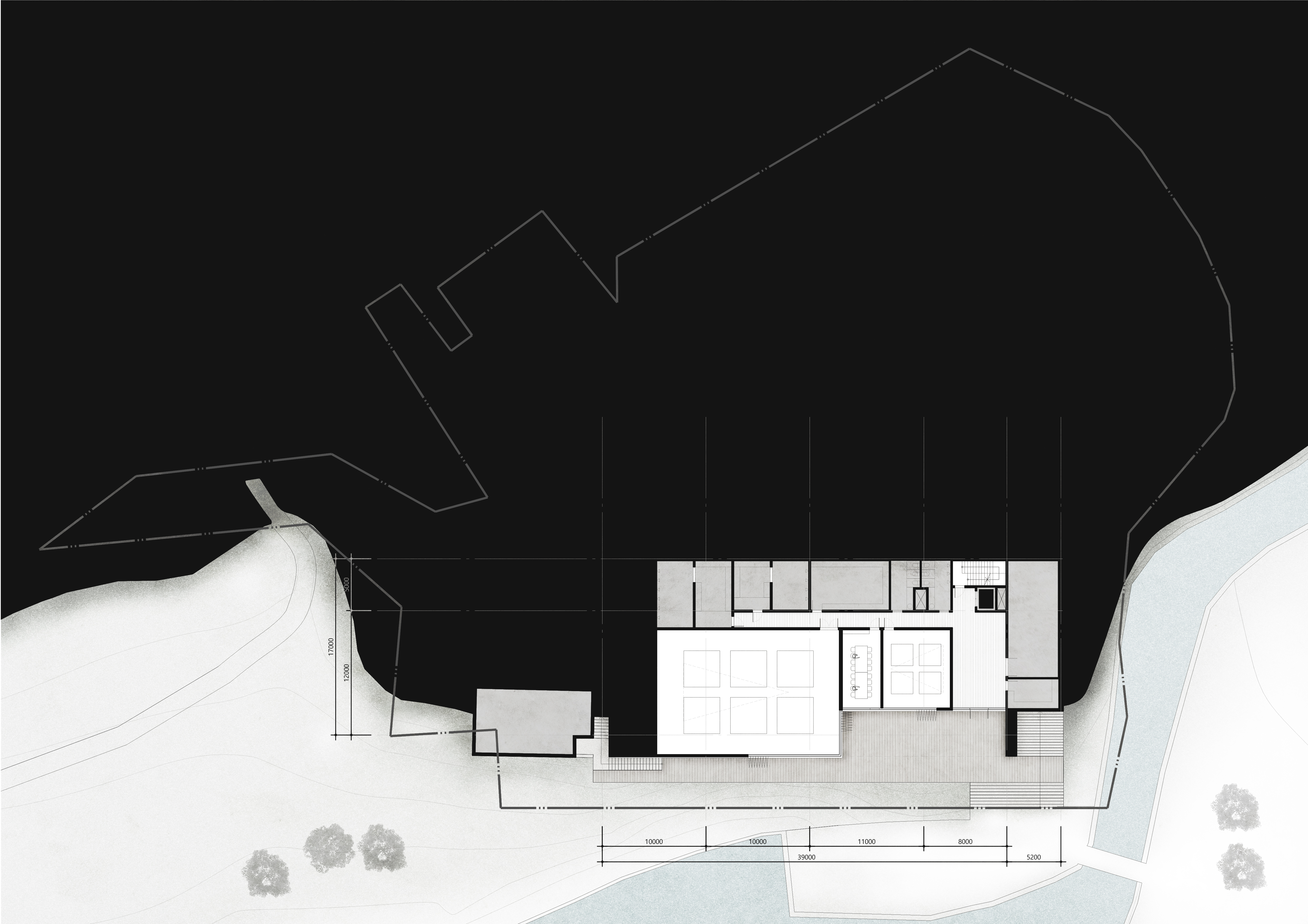 고지점의 산책로와 저지점의 수변공원 사이의 자연적인 지형적 흐름을 보존하고자, 필로티 구조를 활용해 띄워진 민속예술관의 1층 마당공간을 마련했다. 이 마당공간은 민속예술관을 방문하는 사용자뿐만 아니라, 산책로와 수변공원을 이용하는 사람들을 위한 다양한 용도의 외부 공간으로 기능한다.