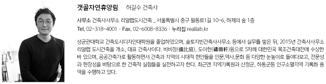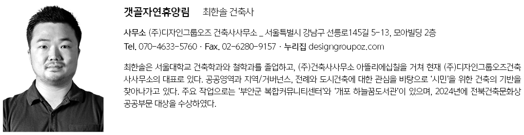 겨울의 갯골은 “계곡이 얼음판이 되는” 명징한 장소가 되고, 가을의 갯골은 “색의 층이 완성되는” 바탕이 된다.(블로그 후기) 방문자들이 건축물보다 계곡과 숲, 테라스가 빚어내는 풍경을 증언하는 것을 보면, 건축을 전면에 세우지 않으려 했던 설계 의도는 자연스레 확인된 셈일 게다. 갯골자연휴양림은 ‘자연과 잘 지내는 법’을 모색한 건축의 태도인 동시에, 건축이 자연 앞에서 마땅히 취해야 할 겸허한 태도를 다시금 상기시키는 결과물이다.
