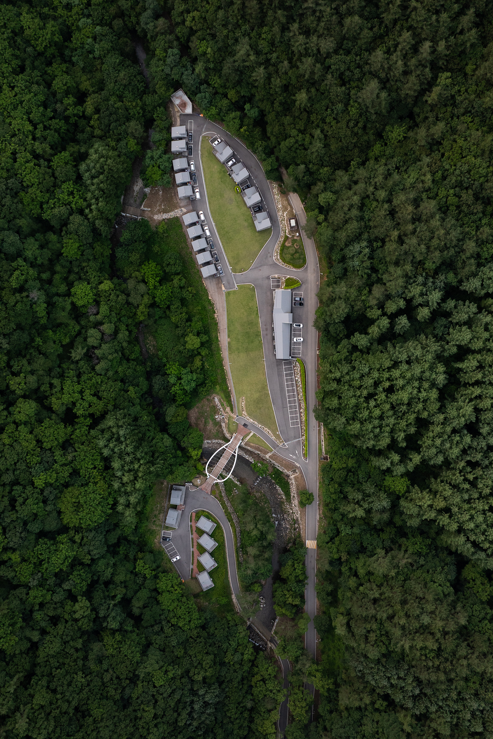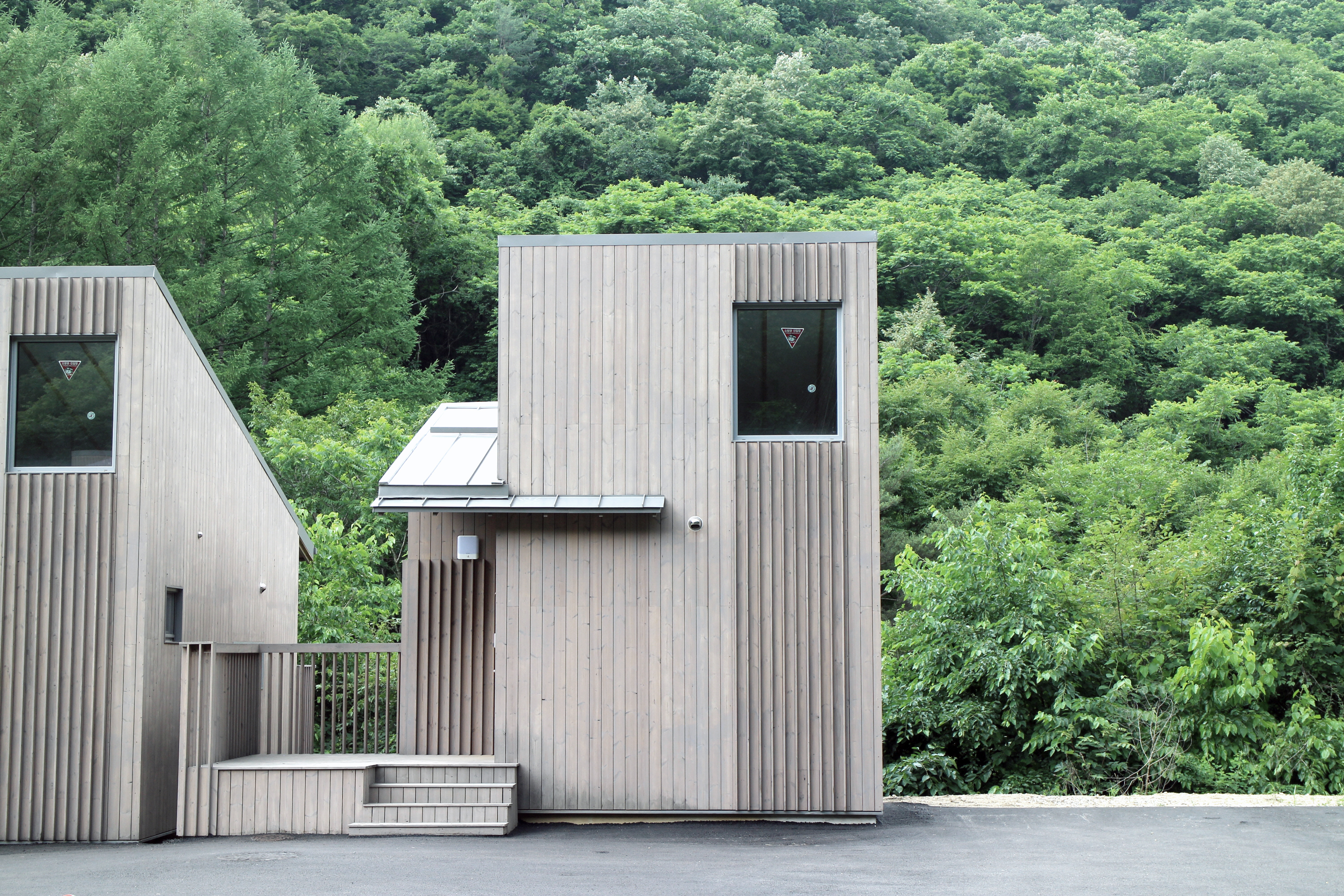 탄화목 사이딩으로 이뤄진 외장재와 천연 방부목, 목재 테라스 데크는 시간과 계절에 따라 풍화되며 숲과 더욱 닮아간다. 외부 동선은 곡선으로 계획해 군집된 개별 동들이 은유적으로 드러나도록 했으며, 시선을 늦춰 사계절의 숲 속에 녹아든 풍경의 층위를 깊게 체감할 수 있도록 배치했다.