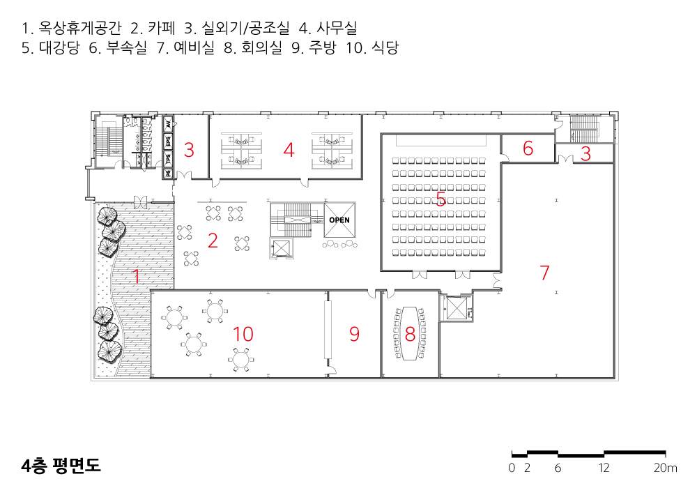 공원의 조망과 채광을 적극적으로 받아들이기 위해 수직 루버를 도입하였고, 출입구에서 옥상 정원까지 이어지는 수직 유리창은 시선을 유도하는 흐름을 만든다. 전면 유리창은 외부 자연의 맥락을 건물 내부로 유입시키며, 내·외부의 관계를 유연하게 풀어낸다. 그 흐름은 입면 전체를 감싸며 파사드의 언어가 되고, 양쪽으로 나뉜 입면은 기존 위에 새로 얹힌 하나의 어휘로 작동한다. 온전한 새로움이 아니라, 본래의 의미를 존중한 결과물. 이 건물이 그렇게 기억되길 바란다.