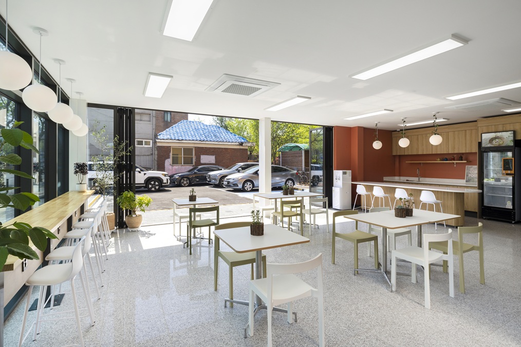 The site was previously a dark, neglected space surrounded by tall, unhealthy trees, permanently in shadow. To breathe life into this expressionless environment, a series of sloped roofs was introduced, along with a bright tangerine-toned façade. The front facing Hancheon-ro was articulated with varied depths to soften the visual impact from the street, while also encouraging a natural flow for pedestrians.