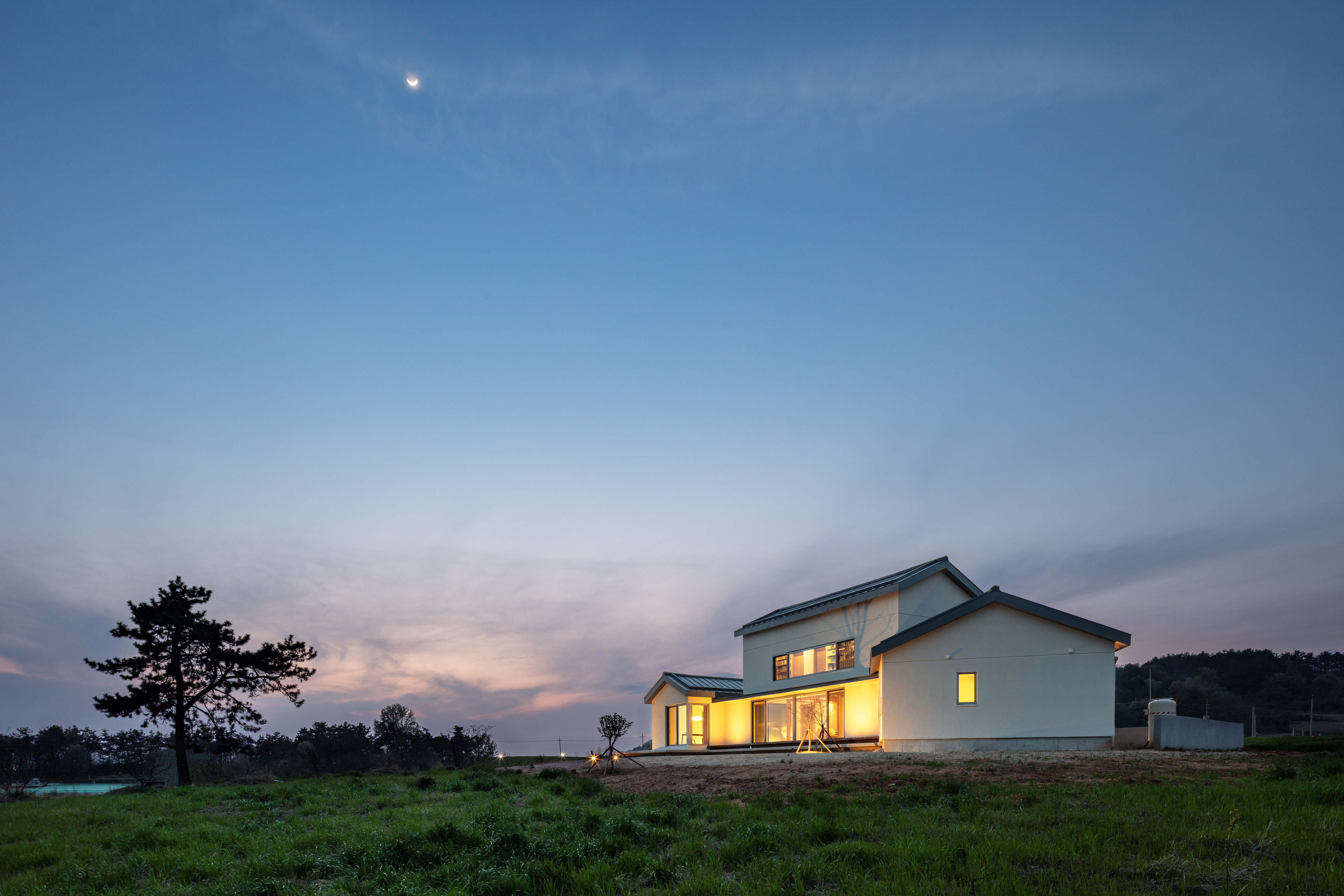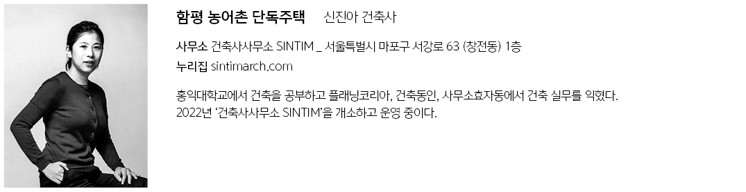 | 함평 농어촌 단독주택 설계자 | 신진아 _ 건축사사무소 SINTIM 건축주 | 남기세, 이민주 감리자 | 신진아 _ 건축사사무소 SINTIM 시공사 | 정영훈, 배규봉 _ (주)제이에스종합건설 설계의도 구현 | 건축사사무소 SINTIM 대지위치 | 전라남도 함평군 손불면 석창리 주요용도 | 단독주택(농어촌단독주택) 대지면적 | 610.00㎡ 건축면적 | 121.50㎡ 연면적 | 148.82㎡ 건폐율 | 19.92% 용적률 | 24.40% 규모 | 2F 구조 | 철근콘크리트구조, 경량목구조 외부마감재 | 외벽 _ 외단열 STO마감 지붕 _ 지정 회색 칼라징크마감 기단 _ 콘크리트 폴리슁 위 하드너 마감 내부마감재 | 강마루, 실크벽지, 타일 설계기간 | 2022. 09 - 2023. 01 공사기간 | 2023. 05 - 2024. 02 사진 | 진효숙 구조분야 | 보브프레임 기계설비·전기분야 | (주)정찬 |
