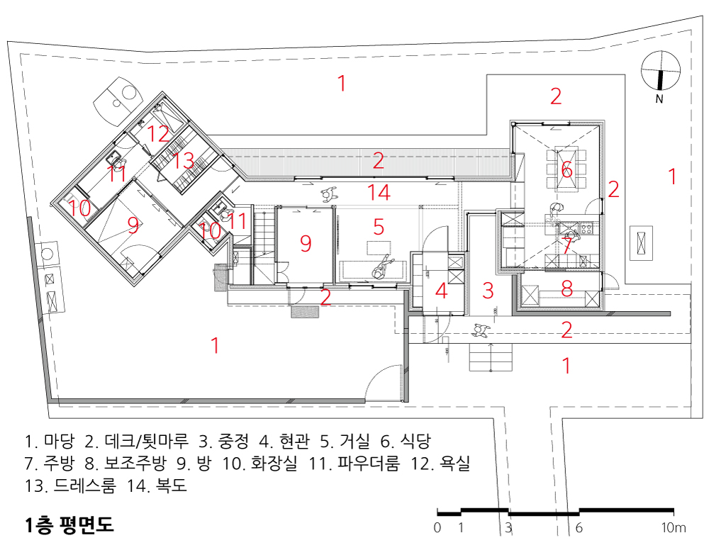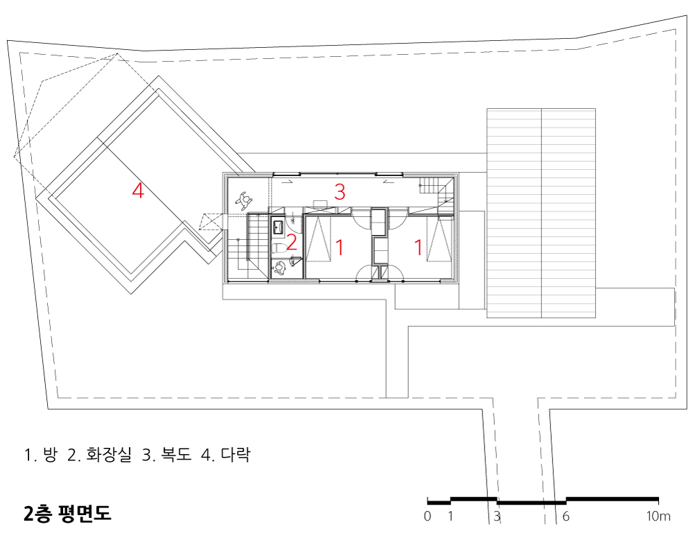 그렇게 집을 세 개의 채로 나누었다. 현관과 손님방이 있는 거실채, 식당이 있는 주방채, 그리고 현관에서 가장 안쪽에 배치된 안방채로 구성했다. 아이들 방은 거실채 위에 올려 중심을 잡았다. 처음 구상한 모습은 단층 주택이었지만, 건폐율 제한과 2층 다락방을 꿈꾸는 아이들의 로망을 반영해 거실채는 2개 층으로 계획했다.