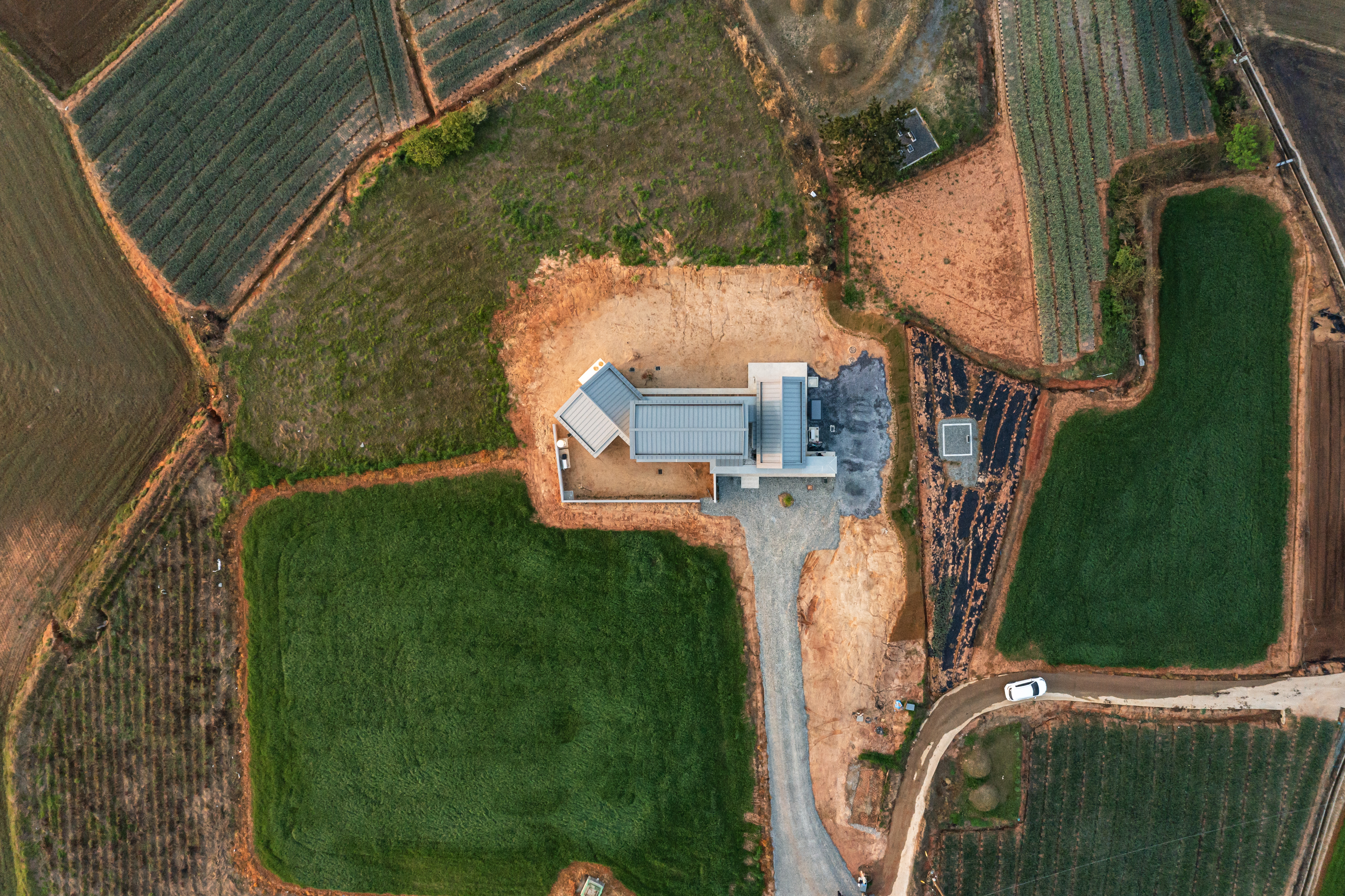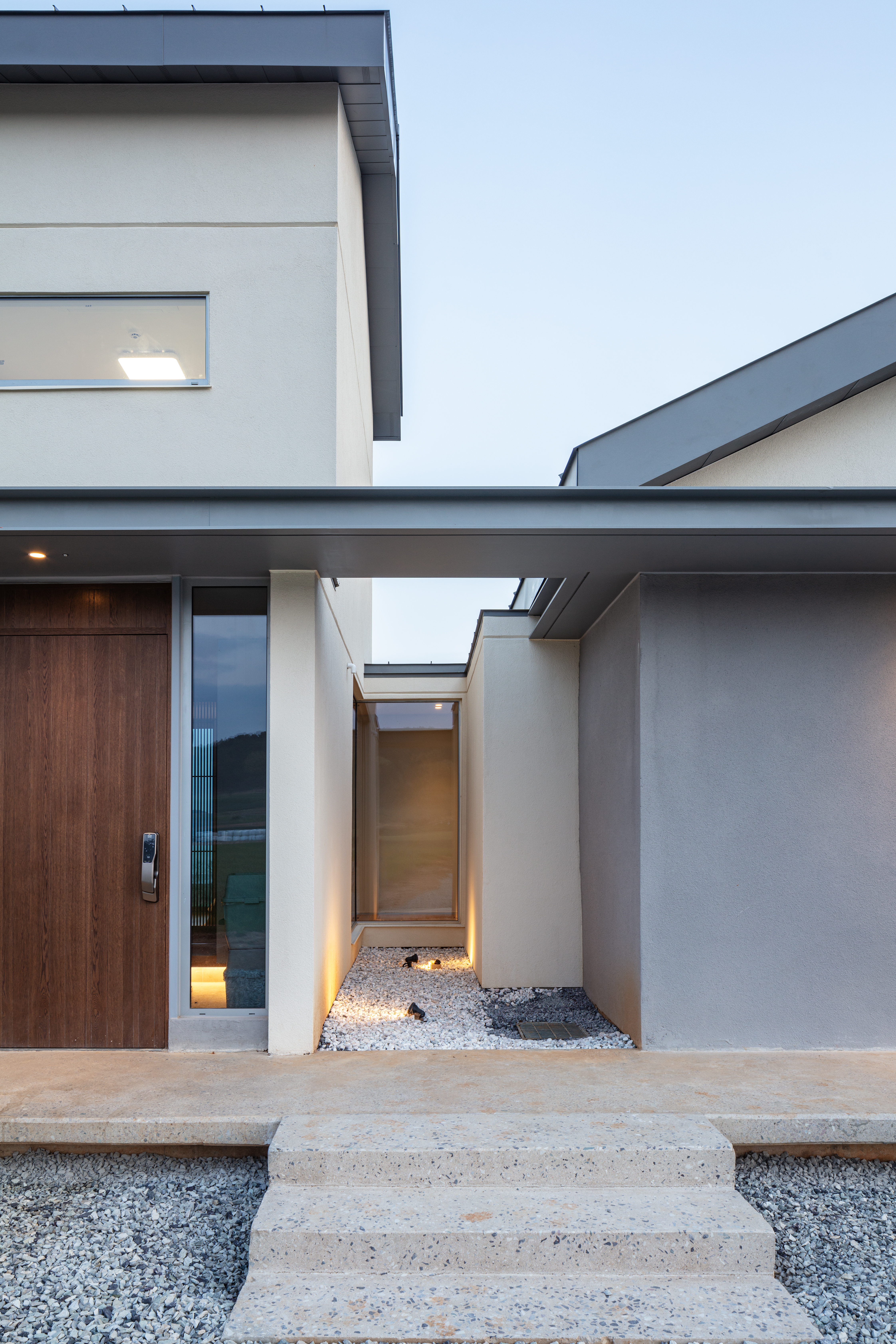 설계를 시작하기 전, 클라이언트와의 인터뷰 자리에서 주거의 각 기능에 따라 공간을 명확히 구분해달라는 요청을 받았다. 거실과 주방조차도 서로 가까이 배치되돼, 소리와 냄새, 시각적으로는 서로 차단되기를 바란다는 요구였고, 이 조건은 오히려 함평 주택 전체의 큰 틀을 설정하는 기초가 됐다. 주변에 이웃한 집이 없고, 넓게 밭으로 펼쳐진 둥근 언덕배기 대지 위에 도심의 집처럼 우뚝 솟은 건물을 짓기보다는, 땅에 낮게 붙어 여러 개의 채가 자연스럽게 툭툭 놓인 모습을 상상했다.