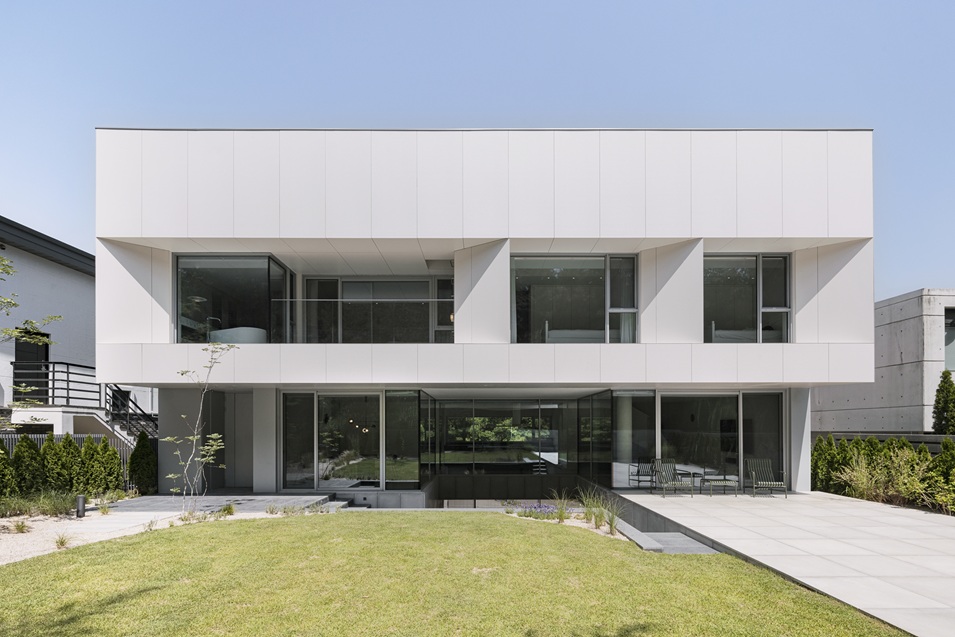북서쪽 도로와 남서쪽의 작은 숲 사이에 위치한 대지는 약 3미터의 레벨 차이를 가진 경사지였다. 건축주는 직선이 강조된 미니멀한 건축 스타일을 추구했기 때문에 시선이 집중되지 않는 방향을 경사지붕으로, 정면과 배면은 평지붕 형태로 계획했다. 1층과 2층은 같은 숲을 바라보지만 입면 구성의 방식에 따라 각기 다른 감도와 거리로 자연과 조우한다.