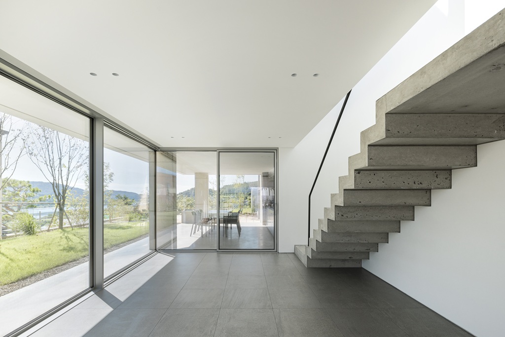 1층의 중심에는 다실이 있다. 이 다실은 단순히 차를 마시는 방이 아니다. 집의 관문이자 사회적 무대, 그리고 사적인 생활과 외부 교류를 잇는 다리 역할을 한다. 손님이 집주인의 사적 공간을 거치지 않고 바로 들어올 수 있는 위치에 자리하며, 삼면이 통창으로 열려 있어 마치 정원에 둘러싸인 정자에 앉아 있는 듯한 개방감을 준다. 여기서 중요한 것은 시선의 흐름이다. 다실에 앉으면 정면에는 강이, 양옆으로는 반외부 공간이 이어진다. 왼편으로는 처마를 받치는 듯한 열주들이 나열되어 있어, 비록 1층이지만 누각에 오른 듯한 시각적 효과를 준다. 오른편에는 야외 주방과 다이닝 공간이 마련되어, 차 한 잔에서 식사까지 다양한 외부 생활이 가능하다. 다실에서 2층으로 향하는 계단실의 설계는 ‘과도기적 경험’을 만들어낸다. 계단의 마감은 노출콘크리트로, 천장과 바닥의 재질과 색을 외부와 비슷하게 마감하여 실내이지만 마치 외부에 있는 듯한 인상을 준다. 방문자는 이 계단을 오르며 점진적으로 강을 향한 개방성에 노출된다. 처음에는 정원과 주변 경관이 부분적으로 보이다가, 2층에 이르면 갑작스럽게 동쪽 전면의 파노라마가 시야를 가득 채운다. 이 순간은 건축이 의도한 ‘풍경의 극장’이자, 거주자가 매일 경험하는 소소한 드라마다.