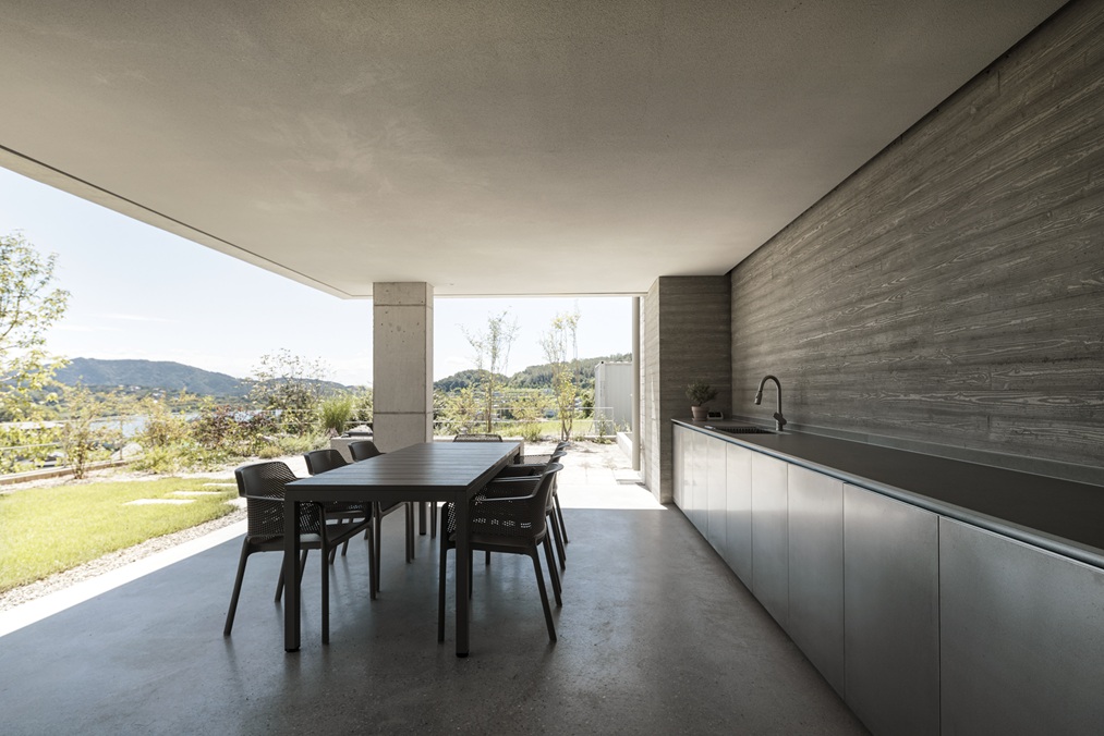 The tea room is the only interior space on the first floor. It serves as both a gateway and a reception room encountered on the way up to the second floor from the entrance. The tea room allows for greeting guests without passing through any private spaces, and is surrounded by a garden, with three sides open through large windows. Although it is an interior space, it offers the openness of sitting in an open pavilion. When facing the river, the semi-outdoor spaces that unfold on both sides of the tea room give the impression that the room extends into the surroundings. To the left of the tea room lies a broad shaded yard a patio that evokes the sense of being elevated, gazing down at the river like from a pavilion, despite being on the first floor. To the right, a simple outdoor kitchen and dining table were arranged. The interior stairs leading to the second floor were finished in exposed concrete, and the ceiling and floor materials were matched to the tones of the exterior materials to evoke the feel of a semi-outdoor space.