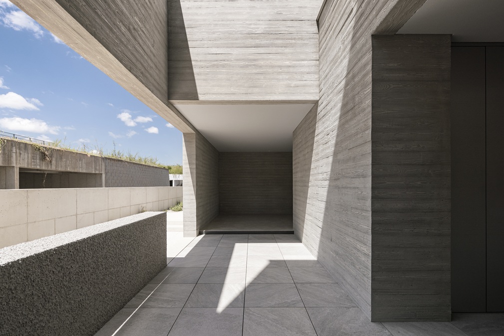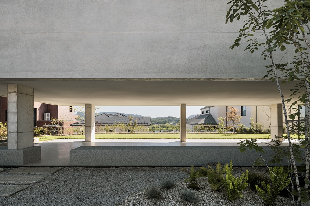 The long mass stretching along the river was lifted one level, with the primary living spaces arranged on the second floor. By positioning these spaces on the east side to maximize the river view and placing the auxiliary spaces along the west-facing roadside, the design results in an open façade to the east and a more closed one to the west. The lifted mass creates an open first floor, consisting of a spacious garden, entrance, tea room, and garage. Rather than using ornate forms or luxurious materials, the design was refined using humble materials, reflecting the calm flow of the Namhan River. The exposed concrete, though inherently cold, was poured against wooden planks attached to the formwork, imprinting a wood grain texture onto the surface to convey warmth.