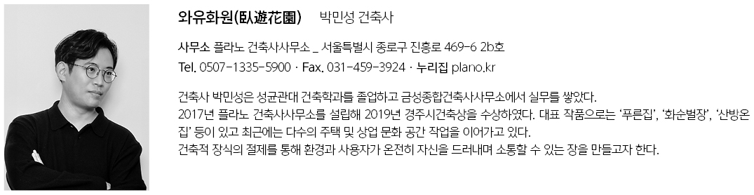 | 와유화원(臥遊花園) 설계자 | 박민성 _ 플라노 건축사사무소 건축주 | 김은정 감리자 | 박민성 _ 플라노 건축사사무소 시공사 | (주)에이더스 종합건설 설계팀 | 이원길, 김근혜 설계의도 구현 | 플라노 건축사사무소 대지위치 | 경기도 양평군 강상면 주요용도 | 단독주택 대지면적 | 729.00㎡ 건축면적 | 247.83㎡ 연면적 | 381.34㎡ 건폐율 | 34% 용적률 | 52.31% 규모 | 2F 구조 | 철근콘크리트구조 외부마감재 | 노출콘크리트 내부마감재 | 친환경페인트, 원목마루, 타일 설계기간 | 2022. 03 - 2022. 08 공사기간 | 2023. 06 - 2024. 08 사진 | 최용준 구조분야 | 일맥구조 |