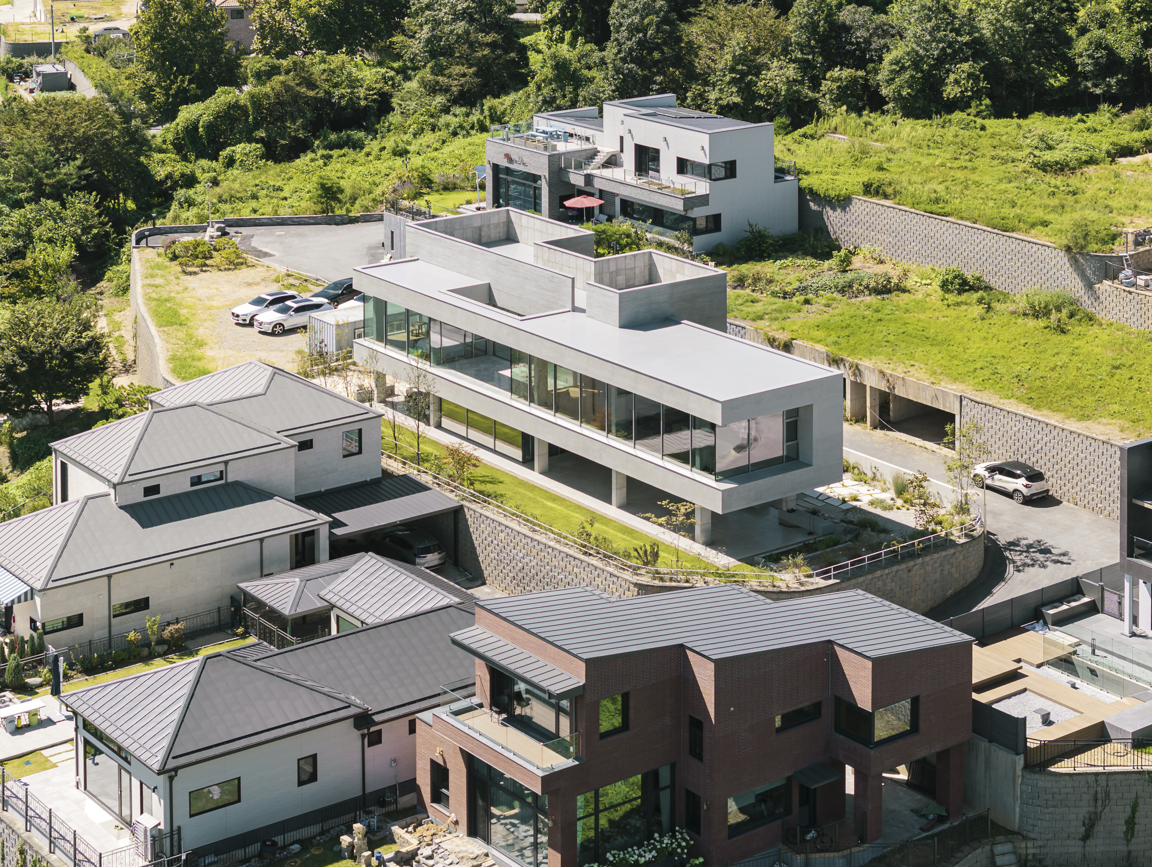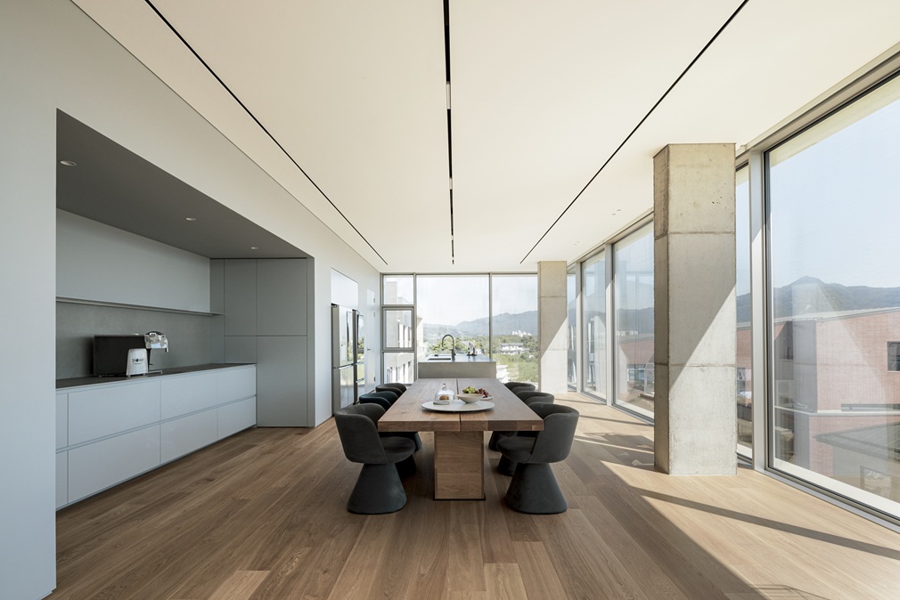 The second floor features an open-plan layout consisting of five spaces kitchen, dining room, living room, deck, and master bedroom oriented eastward toward a panoramic view of the Namhan River. The auxiliary spaces supporting them, such as the utility room, pantry, bathroom, and dressing room, are arranged along the west-facing roadside.