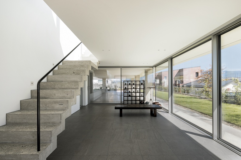 The second-floor deck, offering the closest experience of the Namhan River, serves as a transitional space that vertically and horizontally links various areas at the center of the house. The staircase and hallway connected to the deck link the first and second floors vertically and connect public areas kitchen, dining, and living rooms with private ones such as bedrooms, horizontally. To highlight the surrounding landscape rather than its architectural elements, textures and colors were kept to a minimum, with finishes in exposed concrete, glass railings, and floor tiles in tones similar to the concrete. The staircase and hallway consistently draw in light and views through openings on the deck and west sides, brightening the central area.