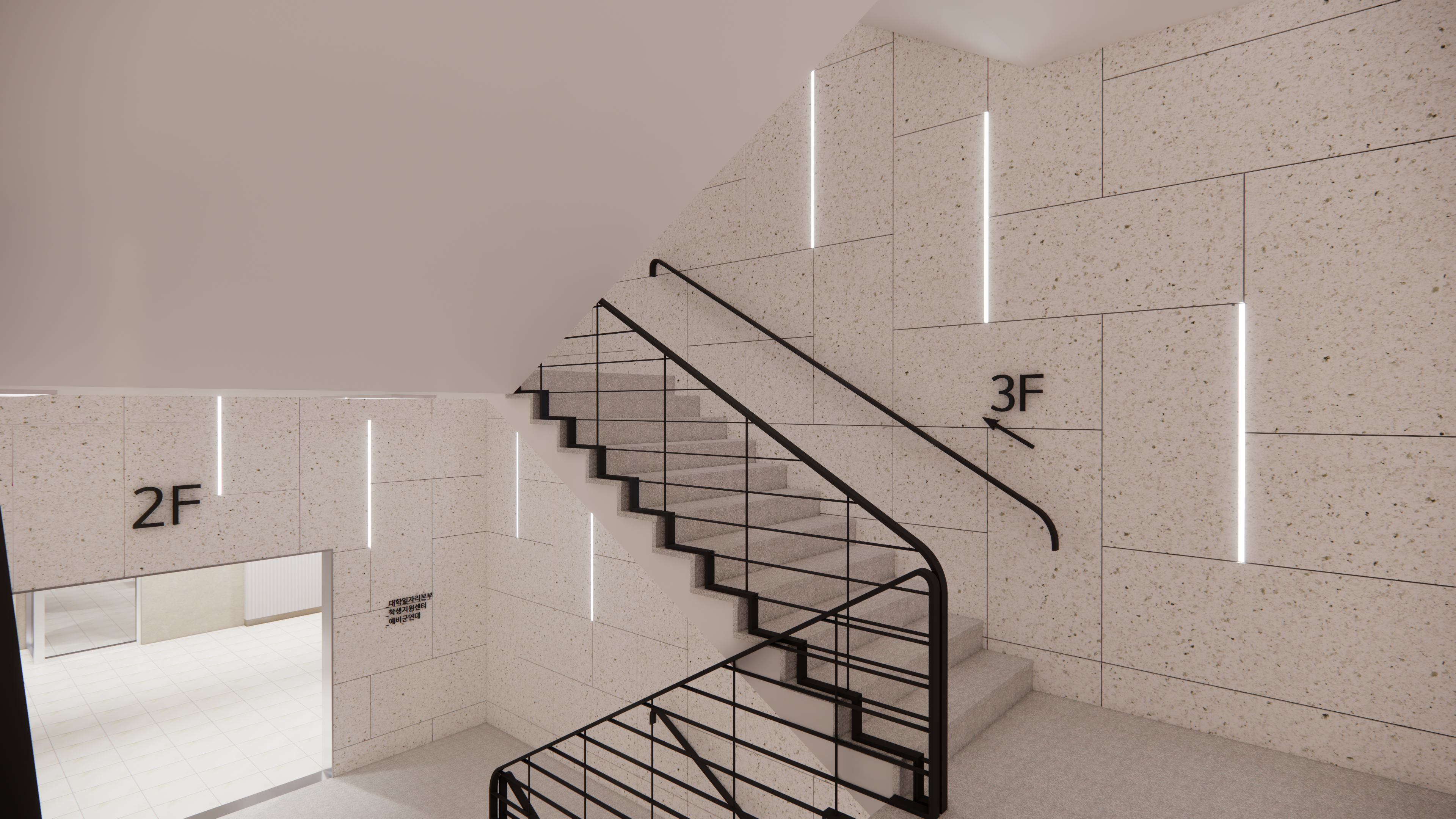 다음으로 말씀드릴 곳은 한밭대학교 학생회관인데요. 환경 개선 프로젝트로 주출입구 파사드와 계단실 복도를 새롭게 디자인하는 케이스이었습니다. 리모델링과 인테리어 요소에 대해 많은 고민을 했고, 라인 조명을 통해 기존의 정형화된 학교이미지를 탈피하려는 시도를 했던 점이 기억에 남습니다.