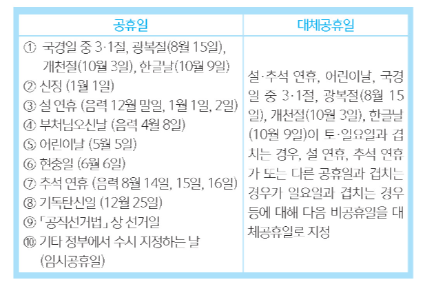 단, 「관공서의 공휴일에 관한 규정」 제2조의 공휴일 중 일요일은 제외되며, 구체적인 공휴일 및 대체공휴일의 종류는 다음과 같다.