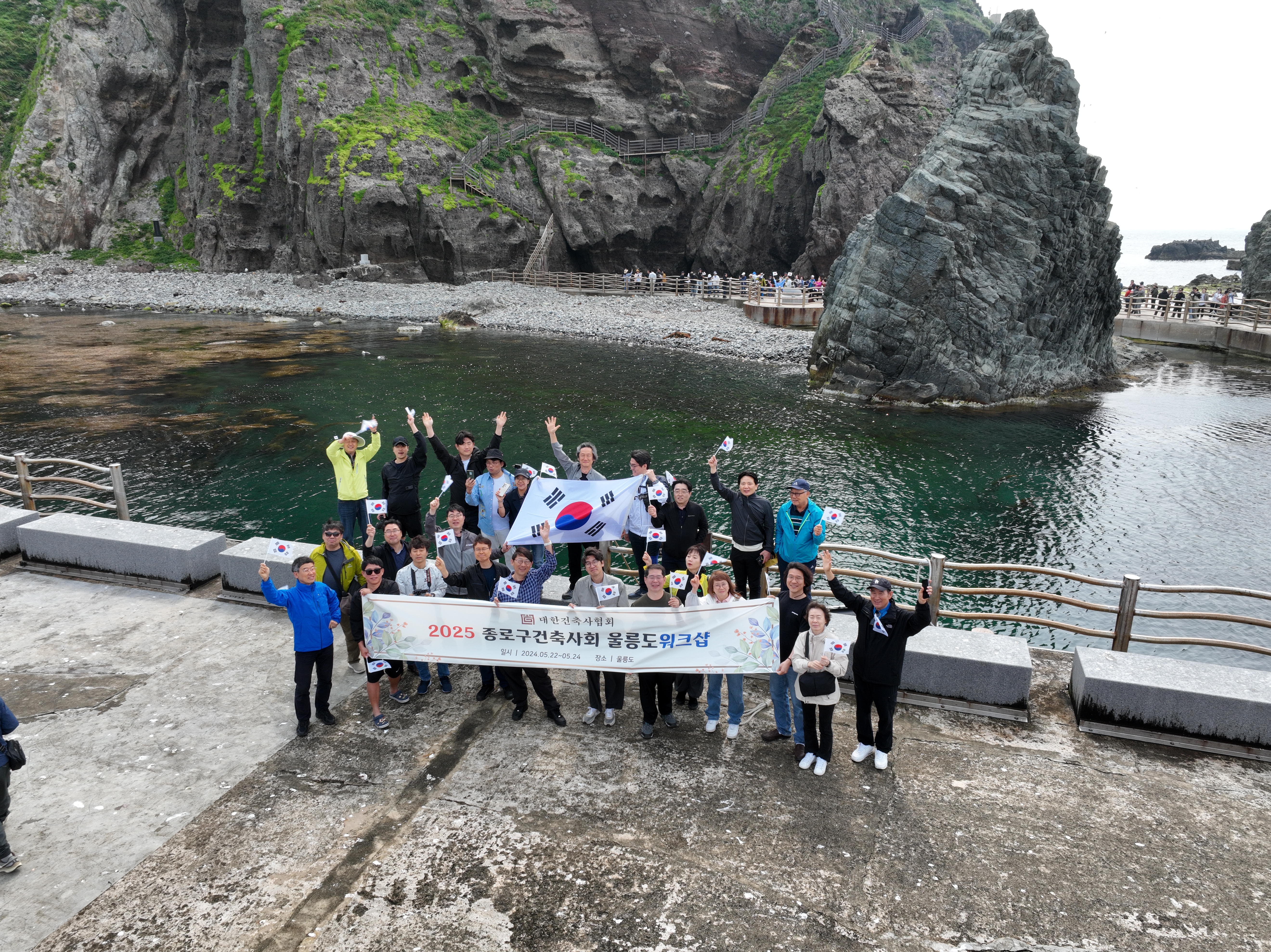 여권도, 비자도 필요 없는, 우리 국민이면 누구나 올 수 있는 땅. 독도는 더 이상 논쟁의 대상이 될 수 없다는 생각이 들었다. 이번 독도 방문을 더욱 특별하게 만든 순간도 있었다. 출발 전, 꼼꼼한 준비로 정평이 난 종로구지역건축사회 총무님께서 드론 촬영을 계획해 주셨고, 울릉군청을 비롯해 문화재청, 독도수비대, 경비대, 해군 1함대 사령부 등 무려 8개 기관에 사전 허가를 요청해 주셨다. 그 덕분에 우리는 독도에서 드론을 띄워 단체 사진을 촬영하는 특별한 경험을 할 수 있었다. 보통은 어려운 일임에도 철저한 준비 덕에 가능했던 일이었고, 종로구지역건축사회만의 또 하나의 값진 기록으로 남게 됐다.