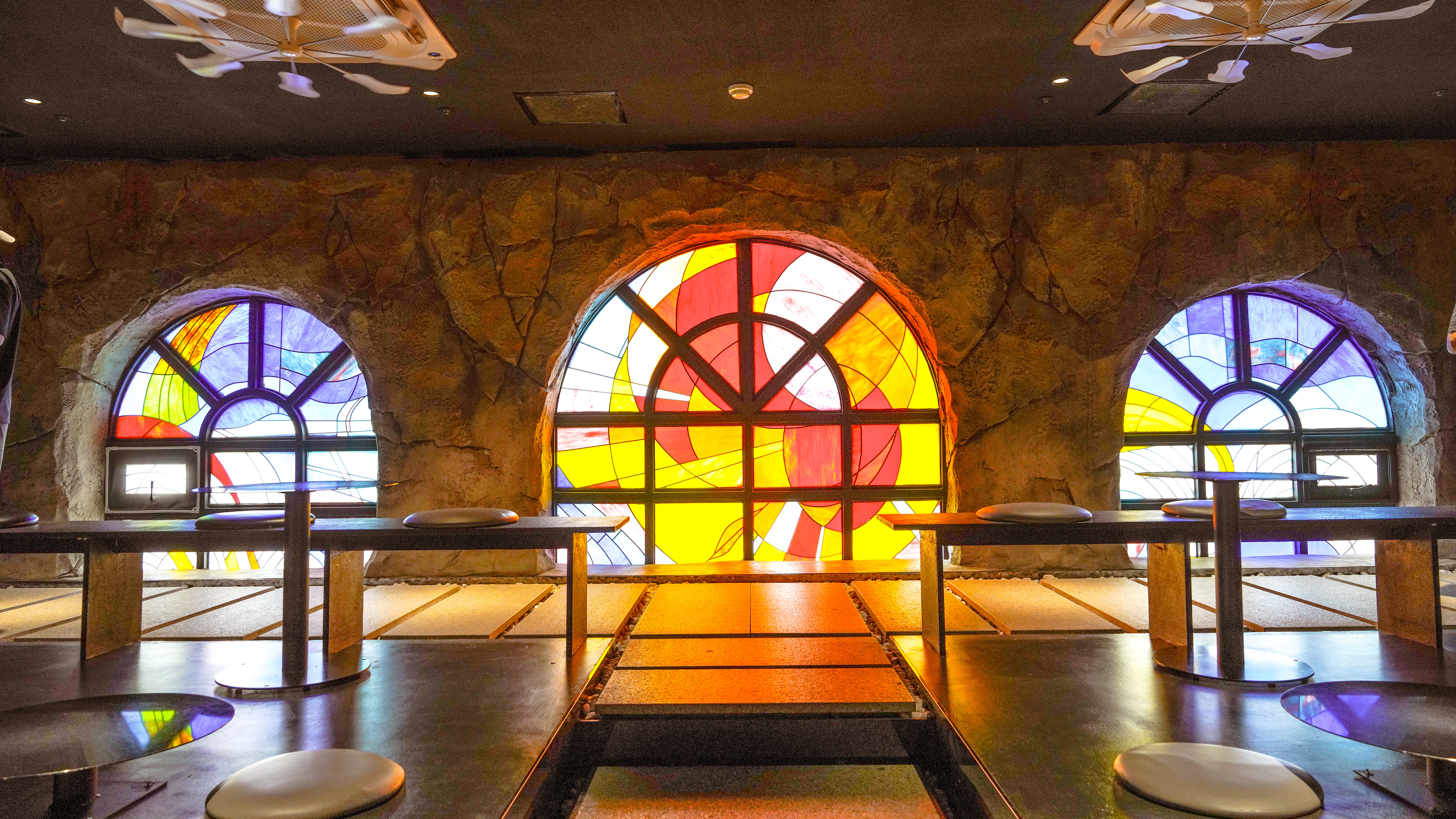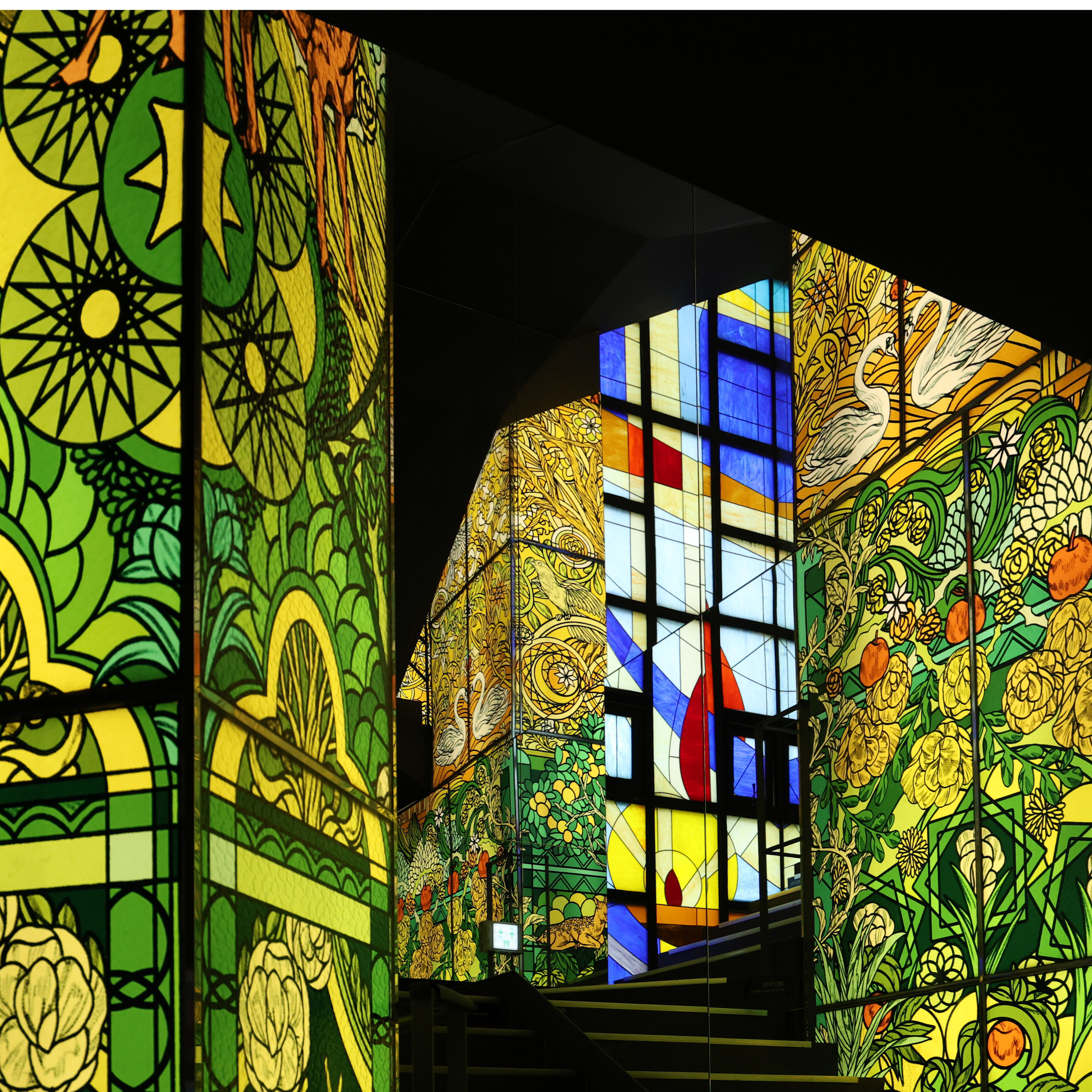 1층은 밝은 조명과 식재, 중앙 기둥이 어우러져 숲속 거실 같은 분위기를 연출한다. 과거 본당이었던 공간은 교류와 휴식, 체험의 중심으로 변모했다. 2층은 거대한 인공 수목과 원형 좌석, 천장에서 내려오는 별빛 같은 조명이 숲속 마당을 형성한다. 벽면의 스테인드글라스는 시간에 따라 다채로운 색채를 드리우며 과거의 기억과 현재의 감각을 겹쳐낸다. 나선형 계단은 수직적 상승감을 강조하며 이동 자체가 하나의 체험이 되도록 설계됐다.