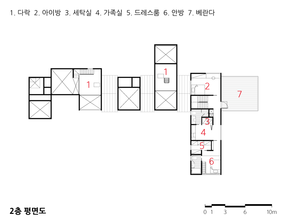 서광리 주택에는 이렇게 목조, 철골, 철근콘크리트 세 가지 구조형식의 장점을 결합한 하이브리드 구조가 적용되었다.