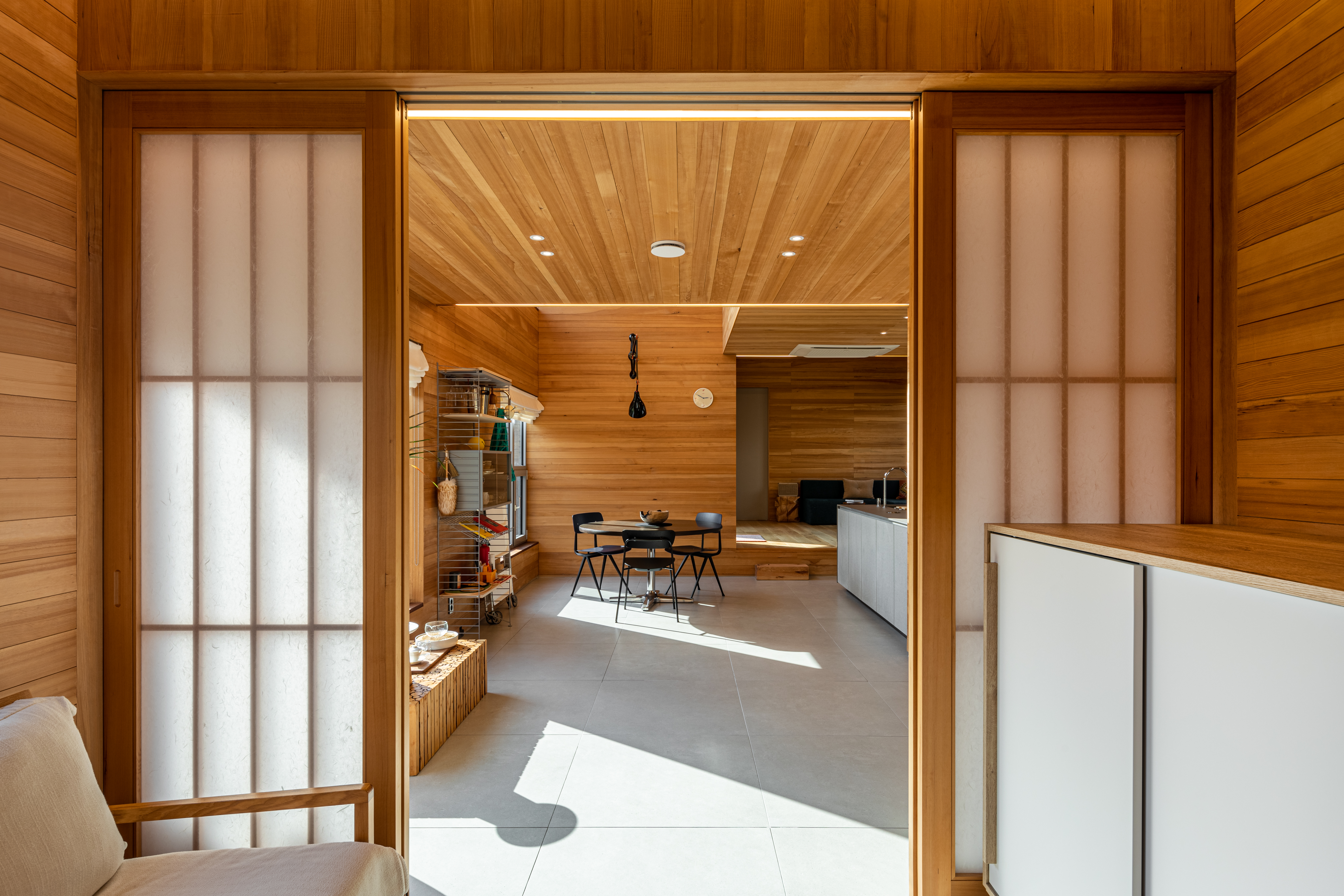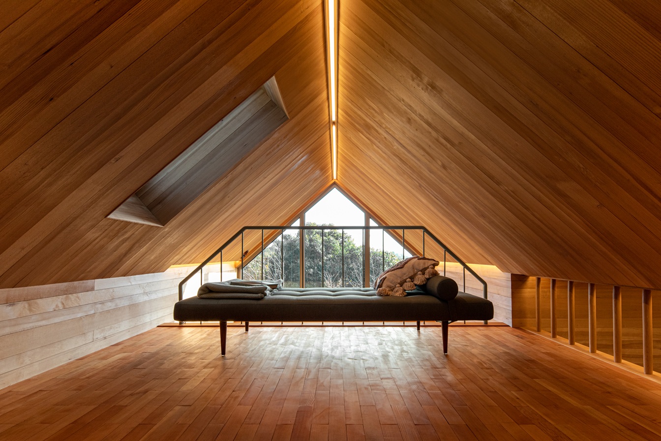 For interior and exterior finishes, a palette of natural woods such as merbau, yellow cedar, and western hemlock was selectively applied to suit each spatial program. This material approach offers guests a tactile and aesthetic experience rarely found in conventional homes. Over time, the wood will naturally age and accumulate architectural history through patina.