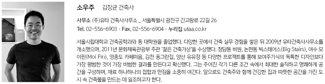 | 소우주 설계자 | 김창균 건축사_ (주)유타 건축사사무소 건축주 | 소유상 감리자 | 김창균 _ (주)유타 건축사사무소 시공사 | (주)스튜가하우스 설계팀 | 배영식, 정선영 설계의도 구현 | 김창균 _ (주)유타 건축사사무소 대지위치 | 제주특별자치도 서귀포시 안덕면 서광리 주요용도 | 다가구주택 대지면적 | 1,210.00㎡ 건축면적 | 228.66㎡ 연면적 | 214.00㎡ 건폐율 | 18.90% 용적률 | 17.69% 규모 | 2F 구조 | 철근콘크리트구조, 철골구조, 경골목구조 외부마감재 | 두라스택 solid tile (허니브라운), 목재 (이페, 아프리카체리, 아프젤,리아, 부빙가, 임파스, 사구라, 샤벨) 내부마감재 | 목재(천장 : 웨스턴햄록, 브라질오크, 옐로우시더 / 내벽 : 웨스턴햄록 / 바닥 : 북미산 홍송) 설계기간 | 2020. 05 – 2021. 01 공사기간 | 2021. 04 - 2022. 05 사진 | 신해수 _ 텍스쳐 온 텍스쳐 구조분야 | 두항구조, 금나구조 |