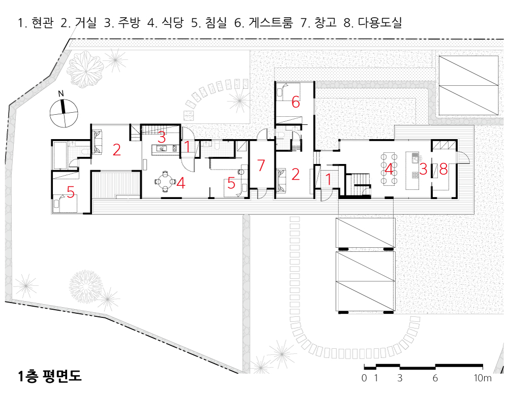 The entry routes to the main and guest houses are clearly separated to ensure privacy. The guesthouse features its own parking space and a tranquil, “olleh trail”-like approach that invites guests to settle in with a sense of calm and seclusion.