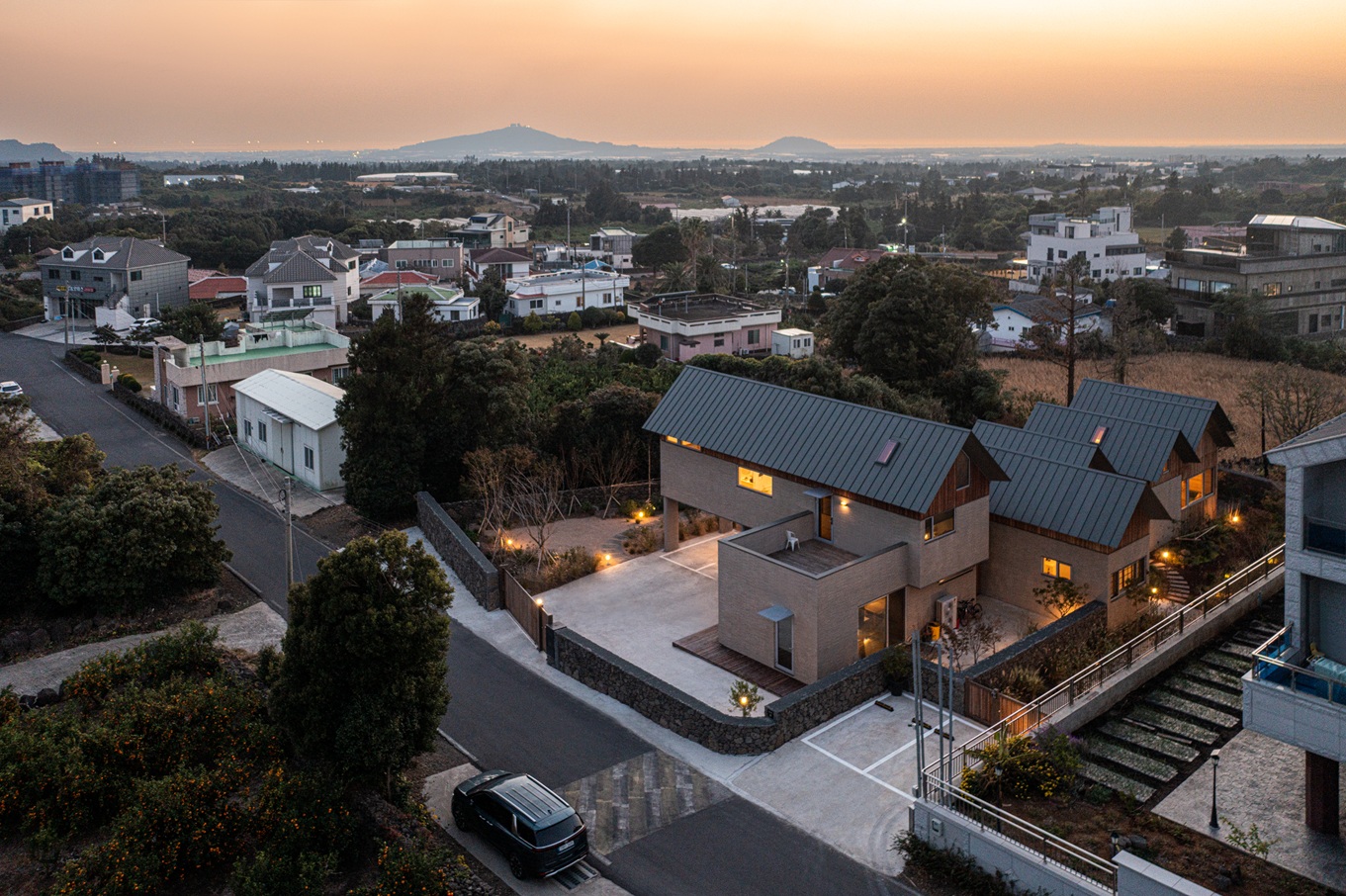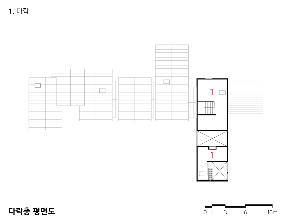 여섯 개의 박공지붕은 제주의 오름을 연상시키는 역동적 스카이라인을 형성하며, 실내에서는 높은 천정고와 다락 활용으로 풍부한 수직적 공간 경험을 제공한다.