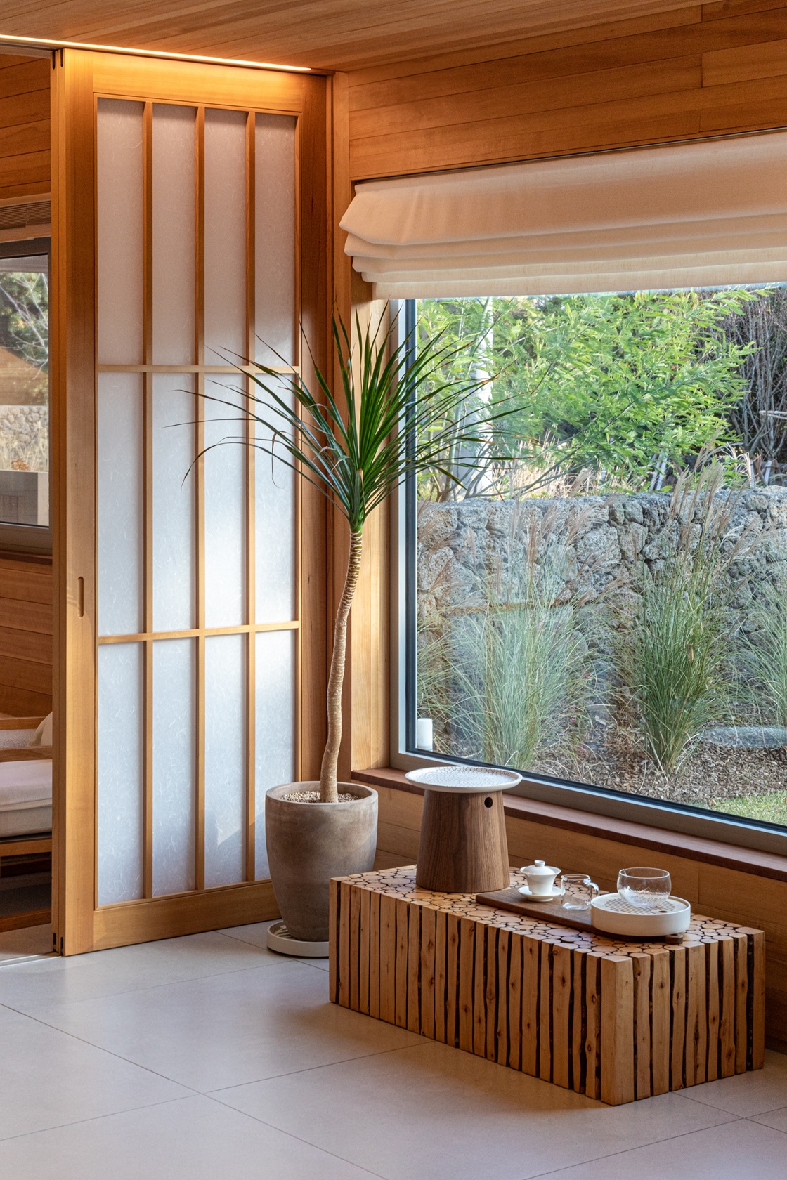 The six gable roofs form a dynamic skyline that evokes Jeju’s iconic oreum (volcanic hills). Inside, these steeply pitched roofs create soaring ceilings and incorporate attic spaces, delivering a vertically expansive and layered spatial experience.