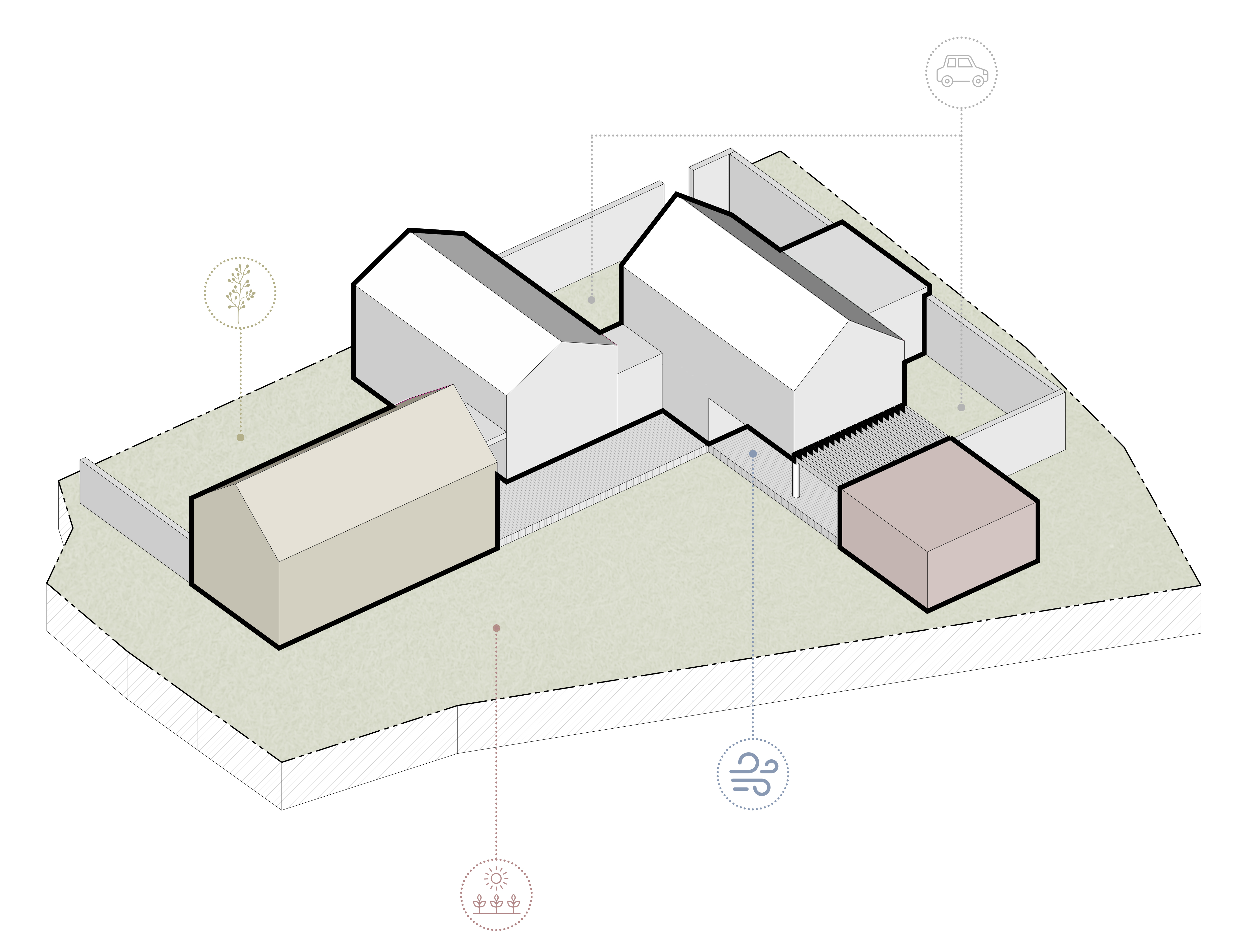 composed of a main house and a detached guesthouse. The buildings are arranged in the shape of a cross (“十”) to create four themed courtyards: a shaded garden, a parking court, a lawn yard, and a moss garden. The design emphasizes both horizontal movement from the eastern entry to the western edge of the site, and vertical articulation in the elevations, offering a rich spatial experience and framed views of the surroundings.