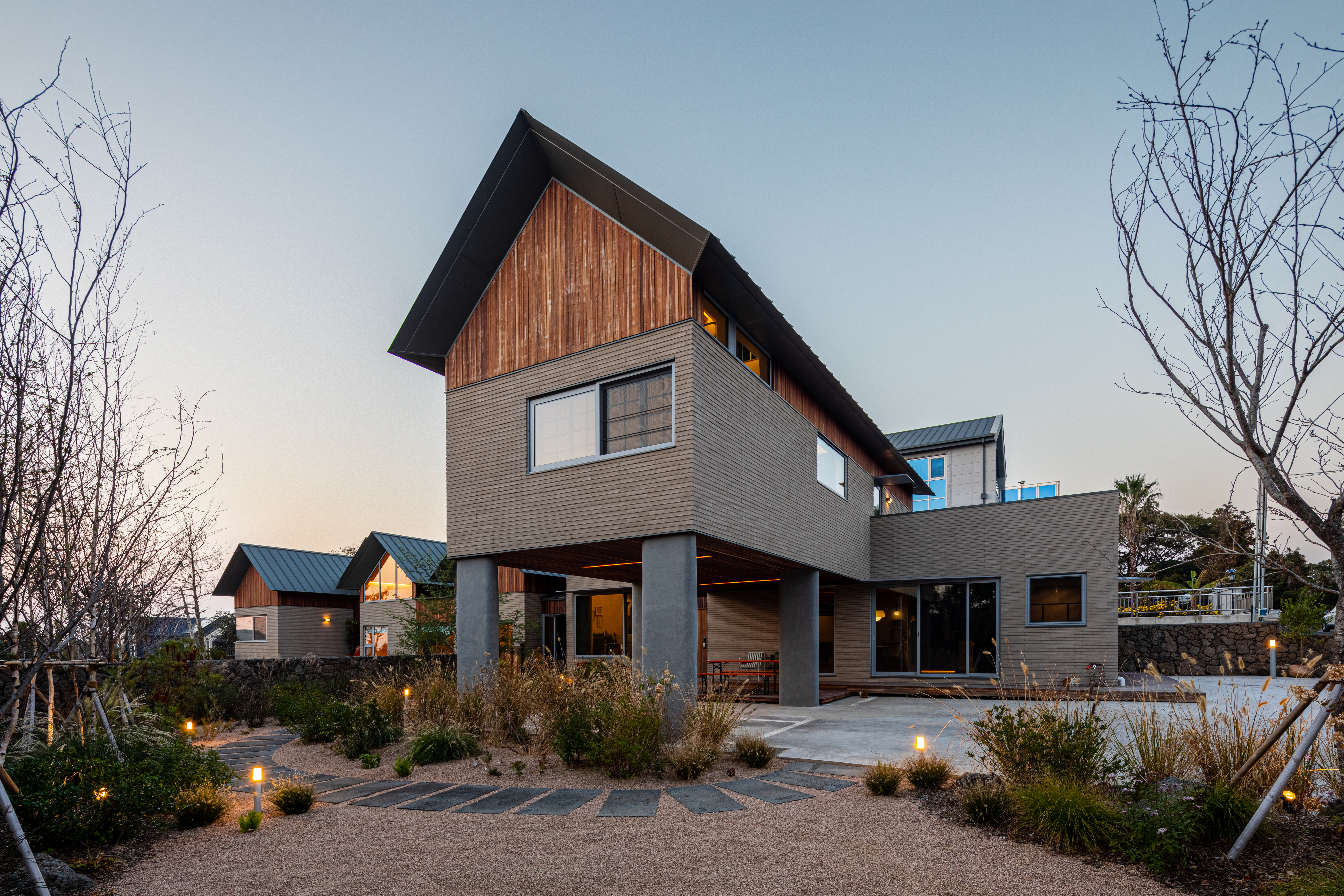 The structure was initially planned as a heavy timber frame system, but was later revised to light wood framing to enhance attic openness, improve constructability, and reduce costs. To withstand Jeju’s harsh wind loads and potential earthquakes, certain sections were reinforced with steel H-beam columns. The approximately 10-meter-long pilotis under the parking area were constructed with reinforced concrete (RC), ensuring structural stability and protection against potential vehicle impact. In this way, the project applies a hybrid structural system that integrates the advantages of wood, steel, and concrete.
