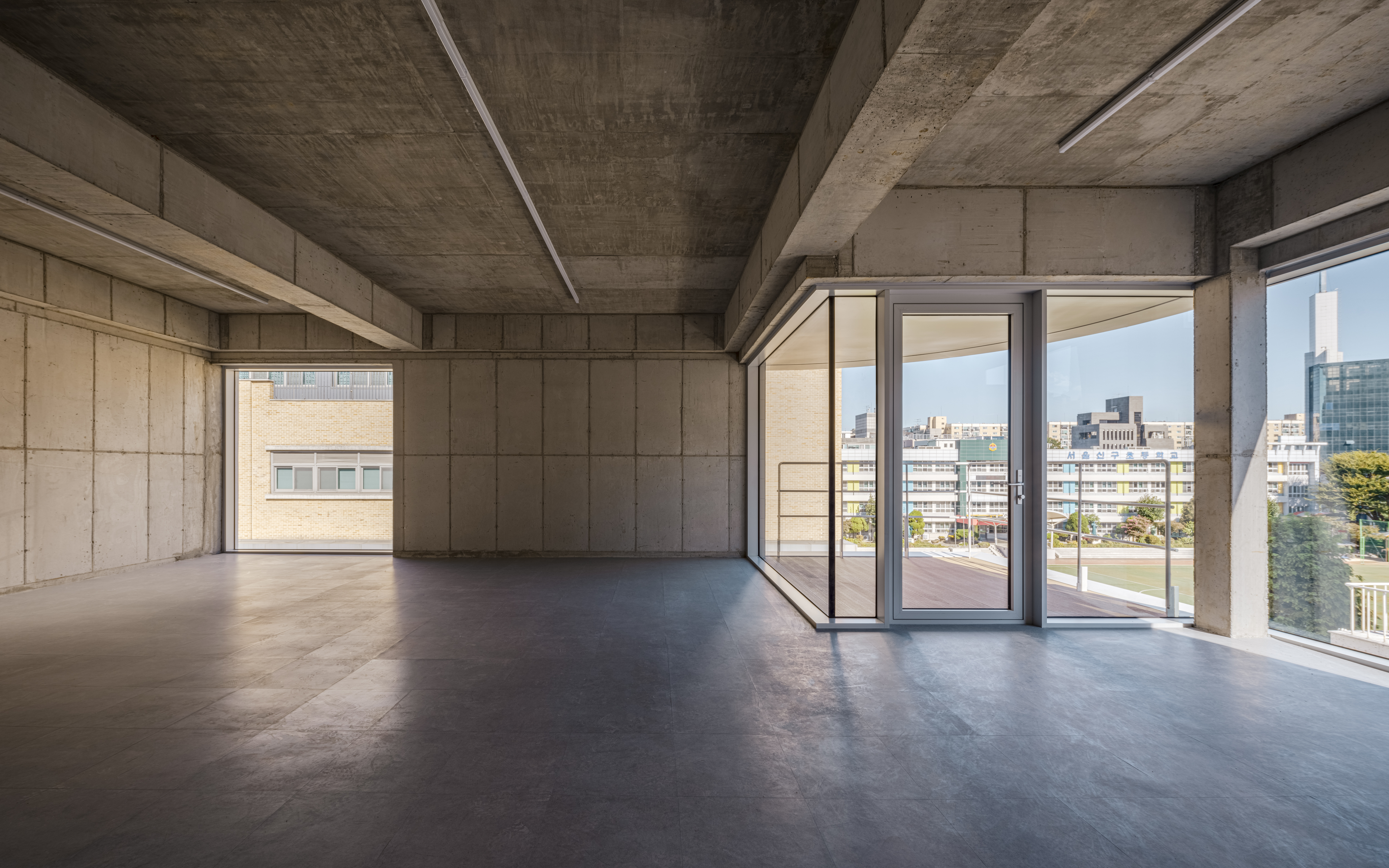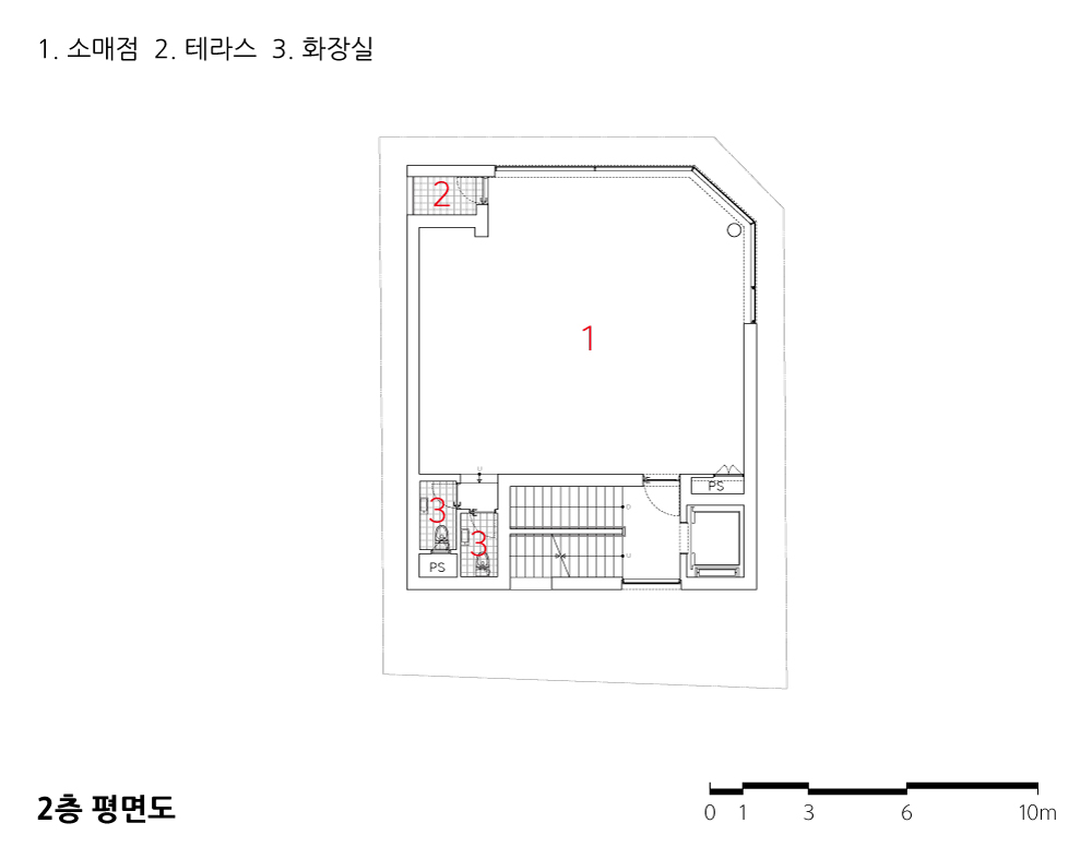 2층의 넓은 전면 커튼월은 시원한 공간을 제공하며 지면층에서 쉽게 노출이 되는, 1층만큼 효과가 높은 층으로 계획되었다. 3층과 4층에서는 넓은 테라스를 통해 각 개별공간의 공간 활용이 향상되며 거주자들의 건강한 환경을 구축하게 된다. 작은 근린생활시설에서 독립적이면서 넓은 테라스 공간의 확보는 일련의 상업시설과는 대비되는 가장 즐거운 공간이다. 특히 학교에 바로 면하고 있어 운동장을 향한 테라스는 도심 속에서 누리기 힘든 시원하게 열린 시야를 확보하게 된다.