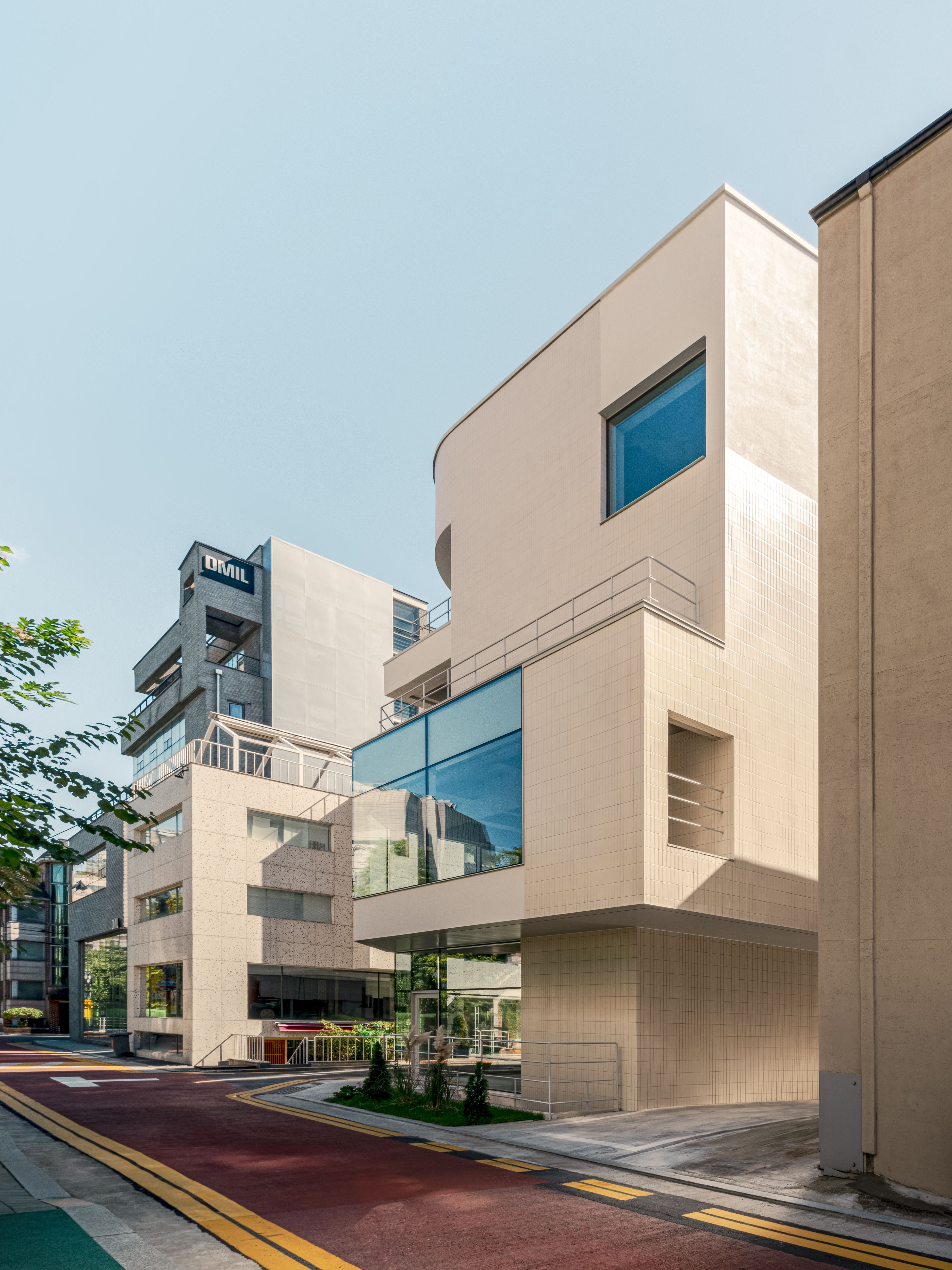 도심 속에서 소규모 건축물로 대표되는 건축물의 하나인 근린생활시설은 용도상 언어가 곧 이미지로 연결되는 대명사가 아닐까 싶다. 그리고 여러 부동산이나 경제적 흐름에 영향을 많이 받는 건축물이기도 하다. 십 수 년 전 다세대주택의 열기에서 이제 관리, 임대, 세금차원에서 효율적인 근린생활시설이 다시 또 소규모건축시장에서 흐름을 만들고 있다. 이 흐름 속에서 제법 독특하고 다양한 건축 시도들이 근래의 건물들에서 엿보이고 또 좋은 사례들이 구축되고 있는 듯하다. 이 다양함속에서 이 프로젝트의 목표는 ‘균질함’ 이었다. 생김새로서의 균질함도 한 부분 일 수 있겠지만 무엇보다도 지하를 포함한 5개 층의 균질함에 도전을 하였다. 생각해보면 쉬운 주제일 수도 있겠지만 작은 대지의 제약 조건 속에서 각층마다의 화장실, 수도사용 공간, 균등한 접근동선, 공평한 채광, 시야 그리고 균질한 면적을 확보한다는 것은 제법 즐거운 시도들 이었다. 그리고 특히 주차면적과 상부동선 등으로 인해 잃어버리기 쉬운 1층을 최대한 확보하여 즐거운 ‘Shopfront‘를 형성하는 부분이 고무적이었다. 접근하기 쉬운 지하층, 지면과 최대한 접하고 열린 1층, 넓은 커튼월로 열린2층, 독립 테라스롤 통해 쾌적한 외기를 갖는 3, 4층등 각층마다의 장점들이 형성되어 5개층 모두의 균질함을 구축하였다.