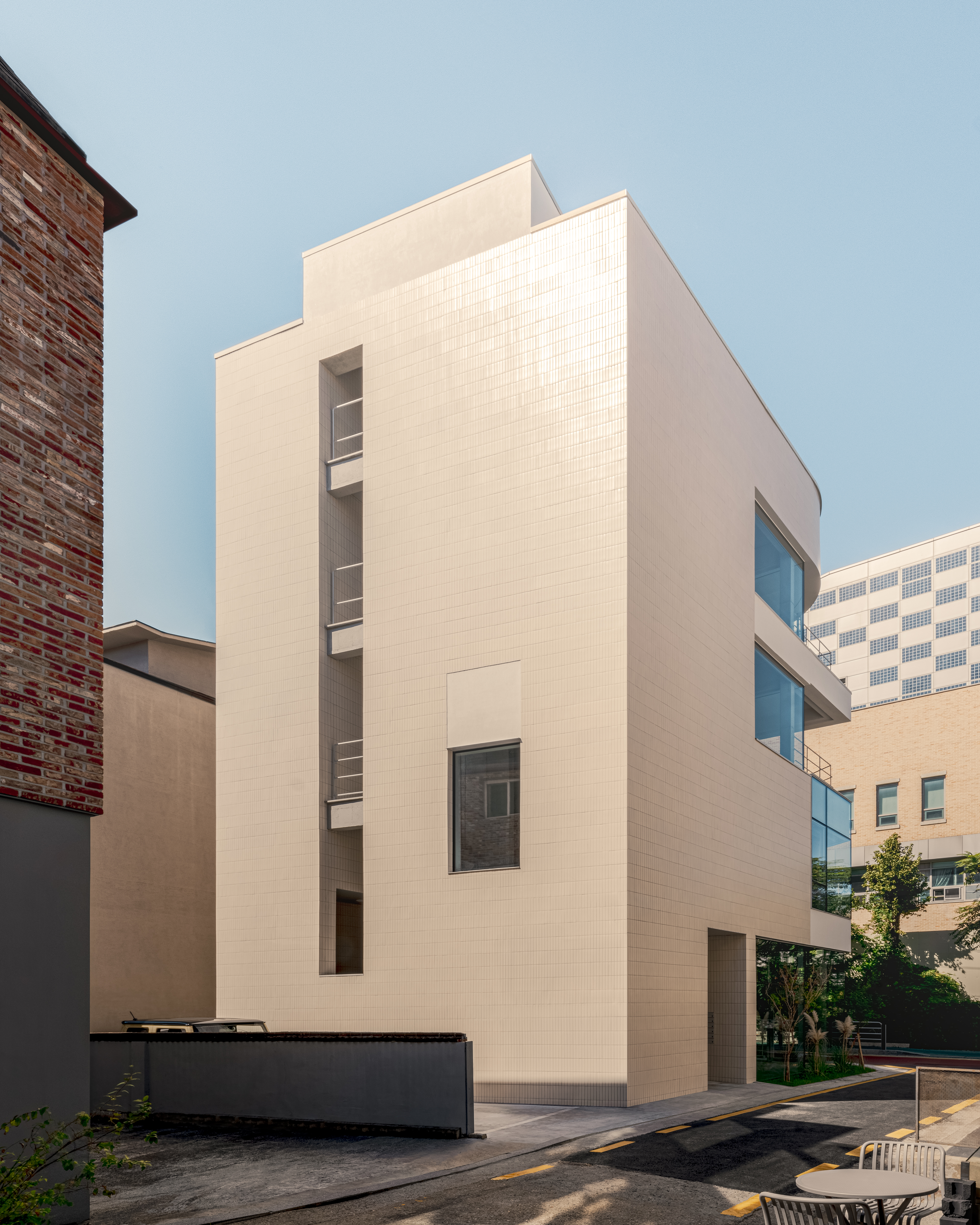 The project site lies just behind Garosu-gil, a street increasingly dominated by new construction and commercial renovations. In contrast to the large-scale commercial buildings along the main road, the backstreets still retain faint traces of Garosu-gil’s earlier charm its diverse and lively mix of small, unique spaces. This project was grounded in a very practical brief: to develop a new building on a corner lot with clear goals for rental viability and commercial visibility, in the context of strong individualistic flows across every alley and building.