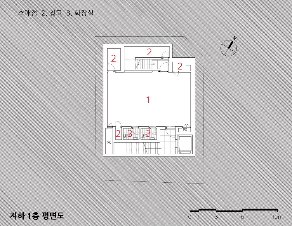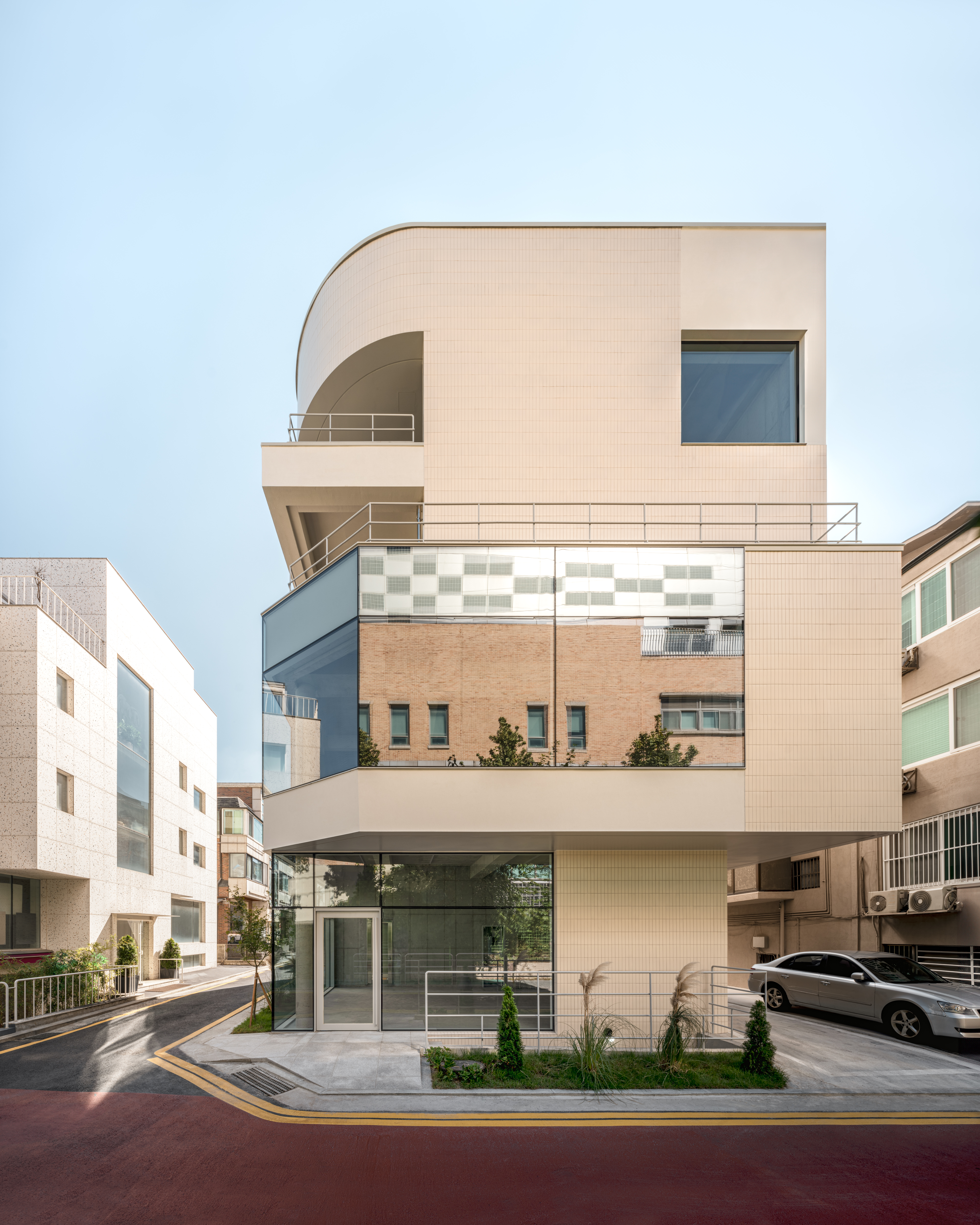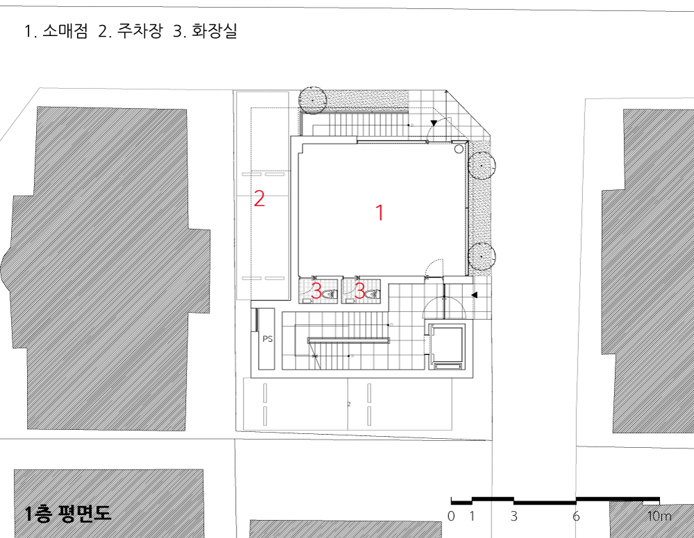 도심 속에서 소규모 건축물로 대표되는 건축물의 하나인 근린생활시설은 용도상 언어가 곧 이미지로 연결되는 대명사가 아닐까 싶다. 그리고 여러 부동산이나 경제적 흐름에 영향을 많이 받는 건축물이기도 하다. 십 수 년 전 다세대주택의 열기에서 이제 관리, 임대, 세금차원에서 효율적인 근린생활시설이 다시 또 소규모건축시장에서 흐름을 만들고 있다. 이 흐름 속에서 제법 독특하고 다양한 건축 시도들이 근래의 건물들에서 엿보이고 또 좋은 사례들이 구축되고 있는 듯하다. 이 다양함속에서 이 프로젝트의 목표는 ‘균질함’ 이었다. 생김새로서의 균질함도 한 부분 일 수 있겠지만 무엇보다도 지하를 포함한 5개 층의 균질함에 도전을 하였다. 생각해보면 쉬운 주제일 수도 있겠지만 작은 대지의 제약 조건 속에서 각층마다의 화장실, 수도사용 공간, 균등한 접근동선, 공평한 채광, 시야 그리고 균질한 면적을 확보한다는 것은 제법 즐거운 시도들 이었다. 그리고 특히 주차면적과 상부동선 등으로 인해 잃어버리기 쉬운 1층을 최대한 확보하여 즐거운 ‘Shopfront‘를 형성하는 부분이 고무적이었다. 접근하기 쉬운 지하층, 지면과 최대한 접하고 열린 1층, 넓은 커튼월로 열린2층, 독립 테라스롤 통해 쾌적한 외기를 갖는 3, 4층등 각층마다의 장점들이 형성되어 5개층 모두의 균질함을 구축하였다.